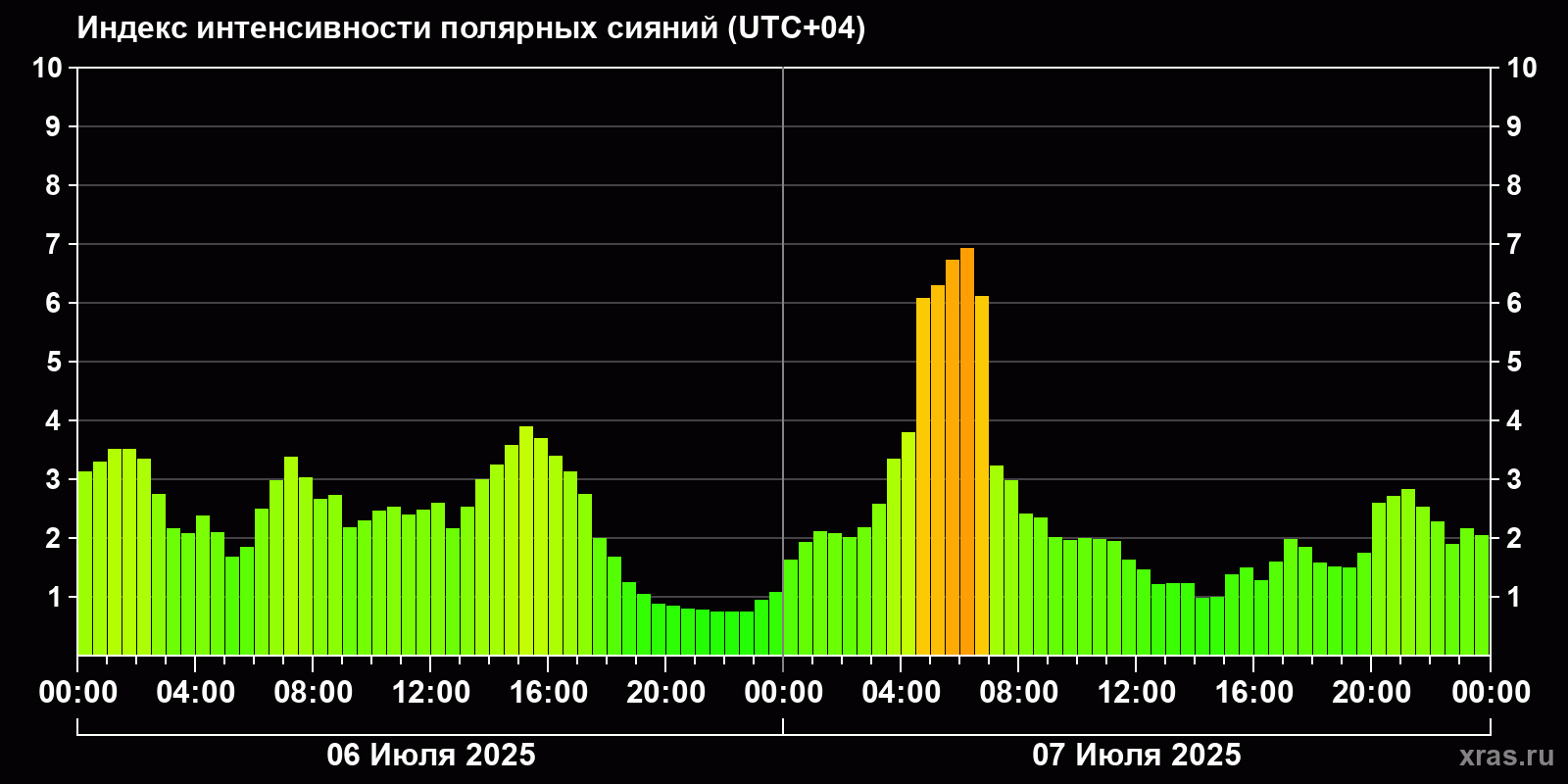 Изменения индекса интенсивности полярных сияний с 2025-07-06 по 2025-07-07 по местному времени