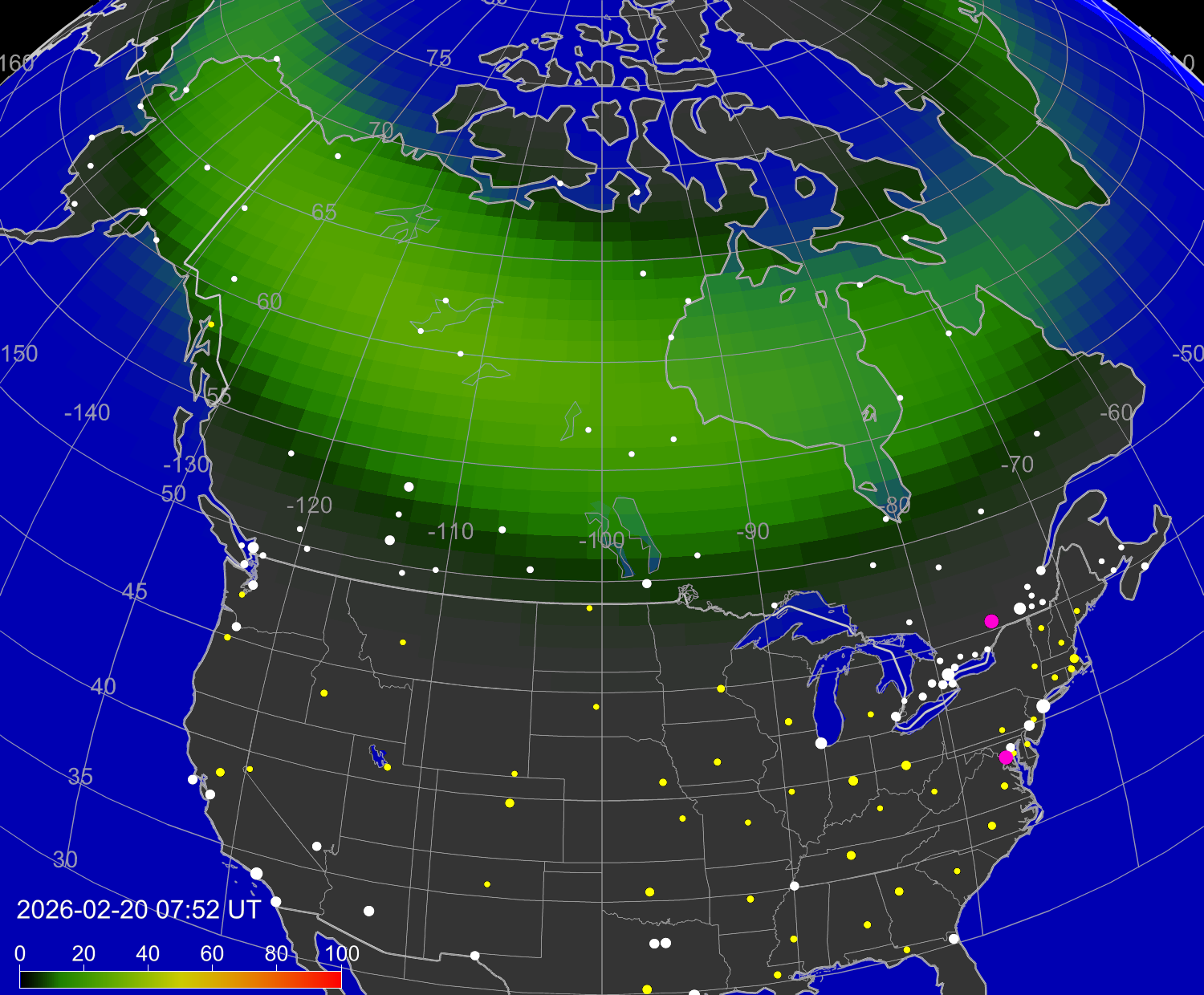 Зона полярных (северных) сияний над территорией Северной Америки