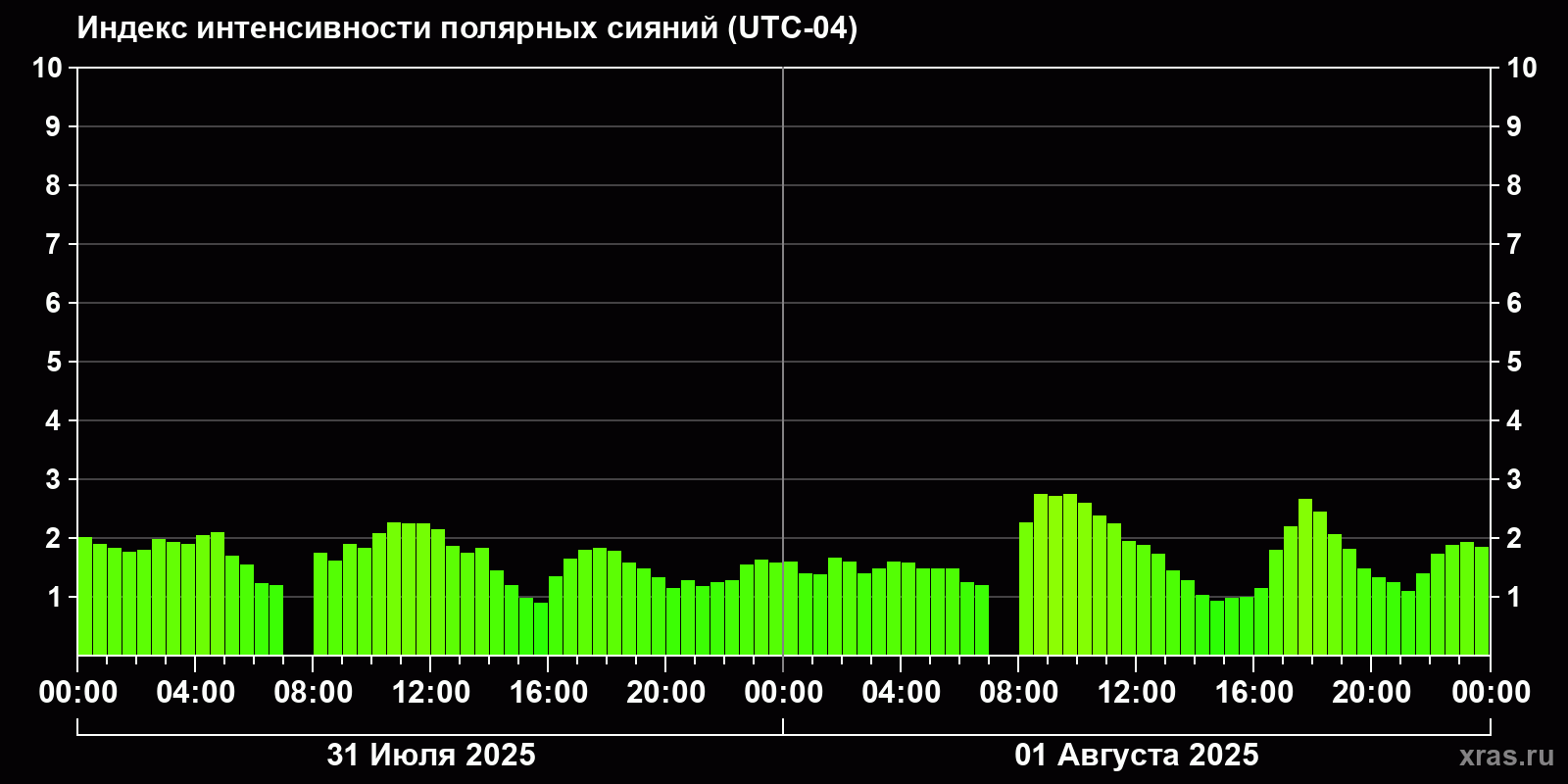 Изменения индекса интенсивности полярных сияний с 2025-07-31 по 2025-08-01 по местному времени