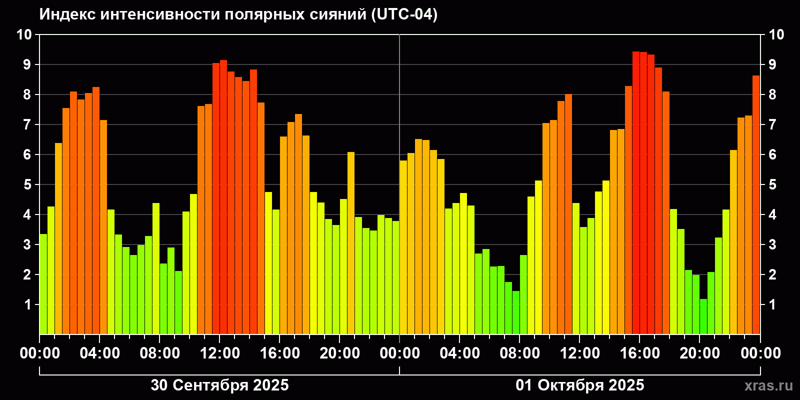 Изменения индекса интенсивности полярных сияний с 2025-09-30 по 2025-10-01 по местному времени