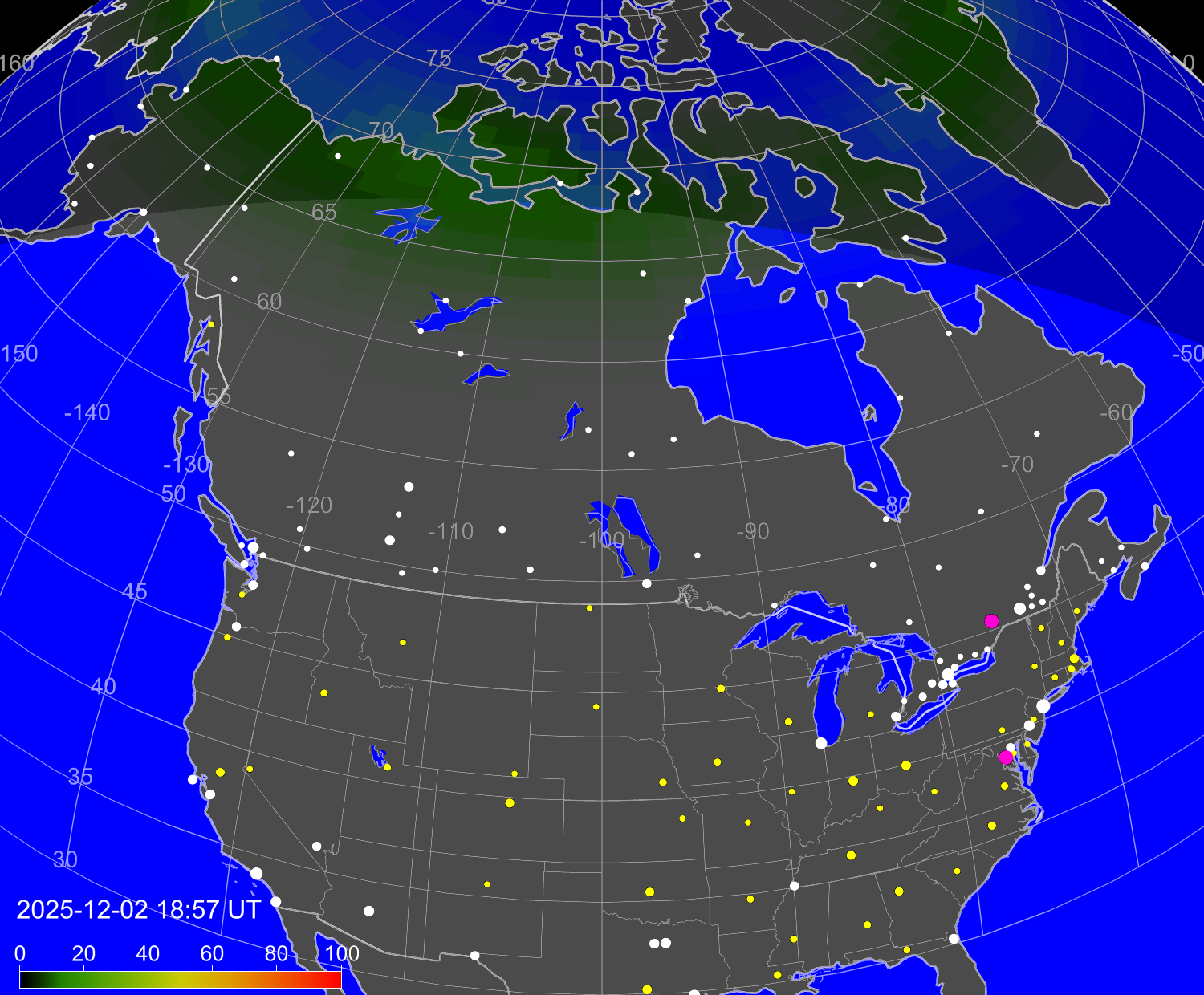 Изменения и часовой прогноз индекса интенсивности полярных сияний с 2025-11-30 по 2025-12-01