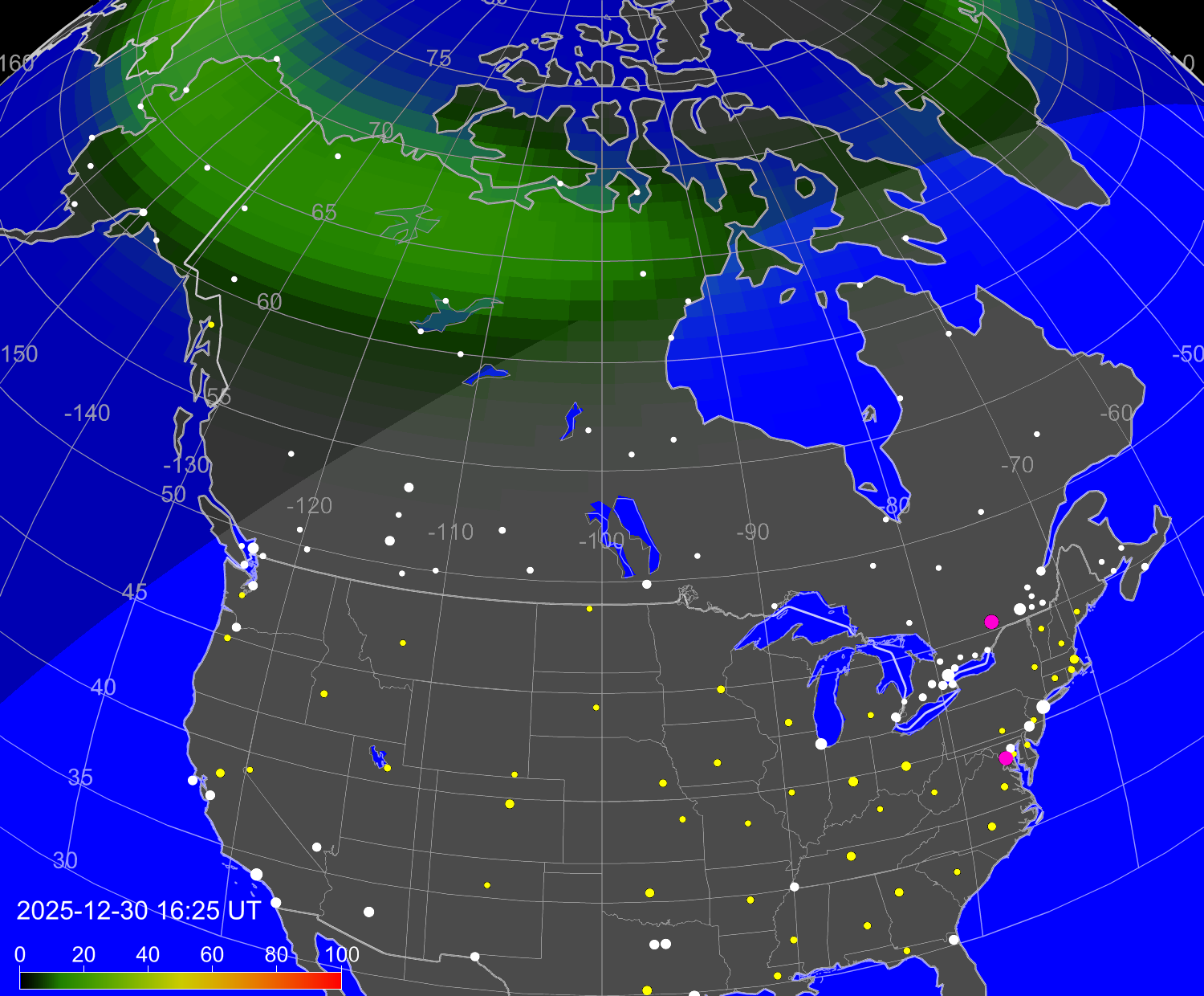 Изменения и часовой прогноз индекса интенсивности полярных сияний с 2025-12-30 по 2025-12-31