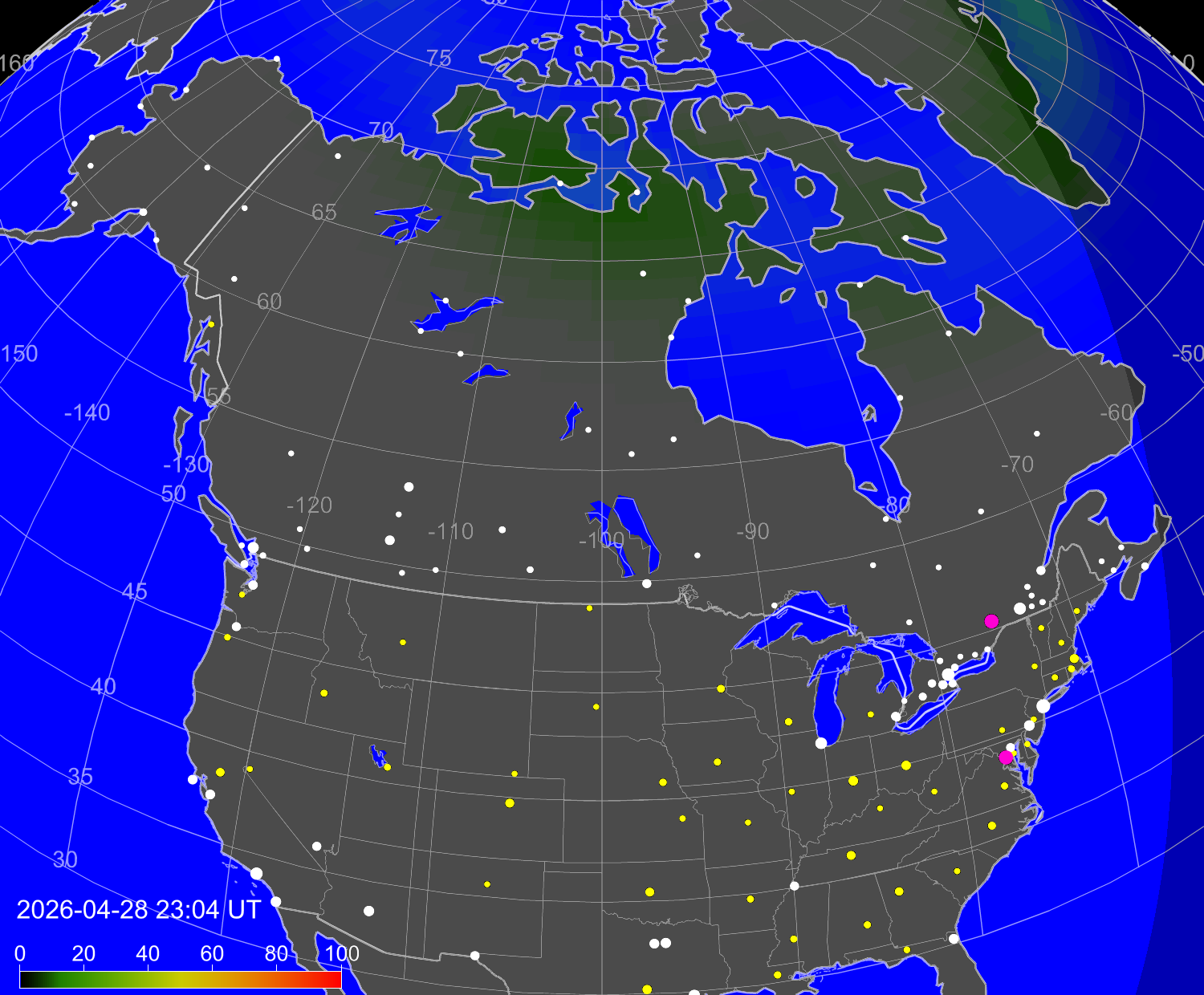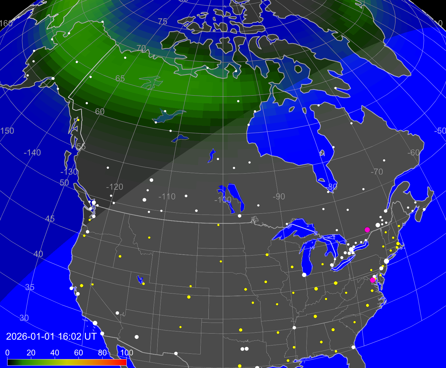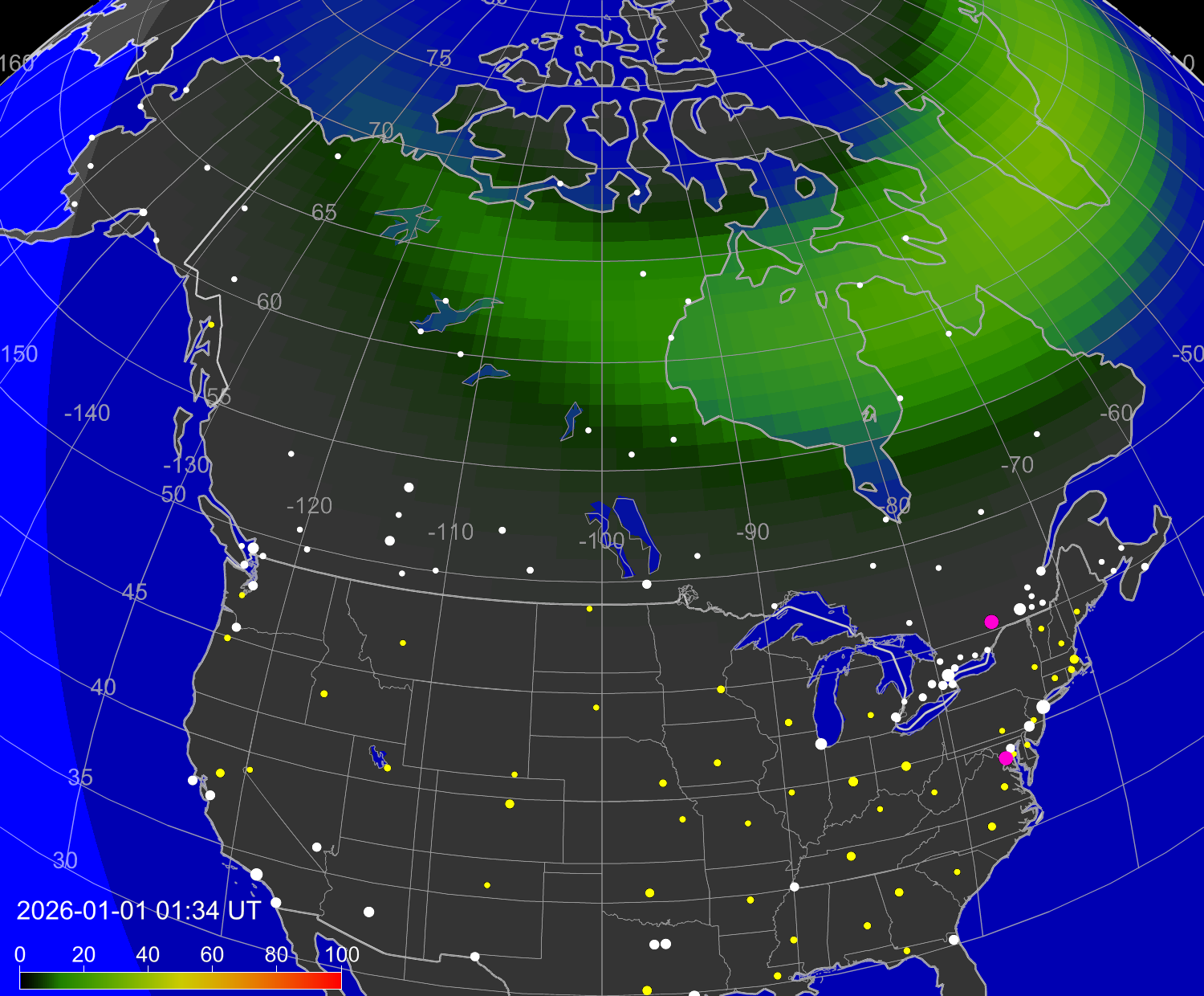 Вероятность полярных сияний в городах Канады
