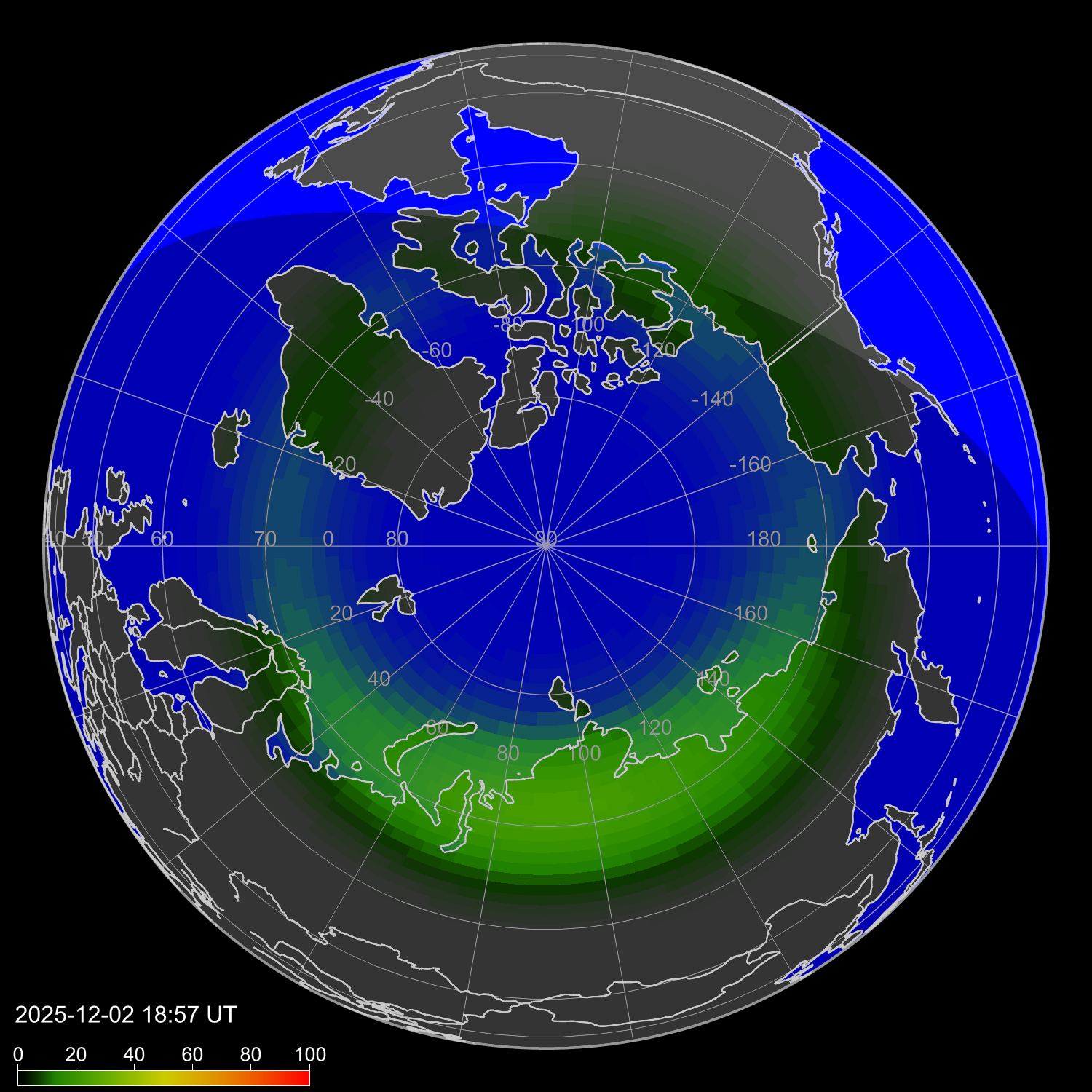 Индекс интенсивности полярных сияний и теоретически возможная широта наблюдений для ночного времени в западном полушарии