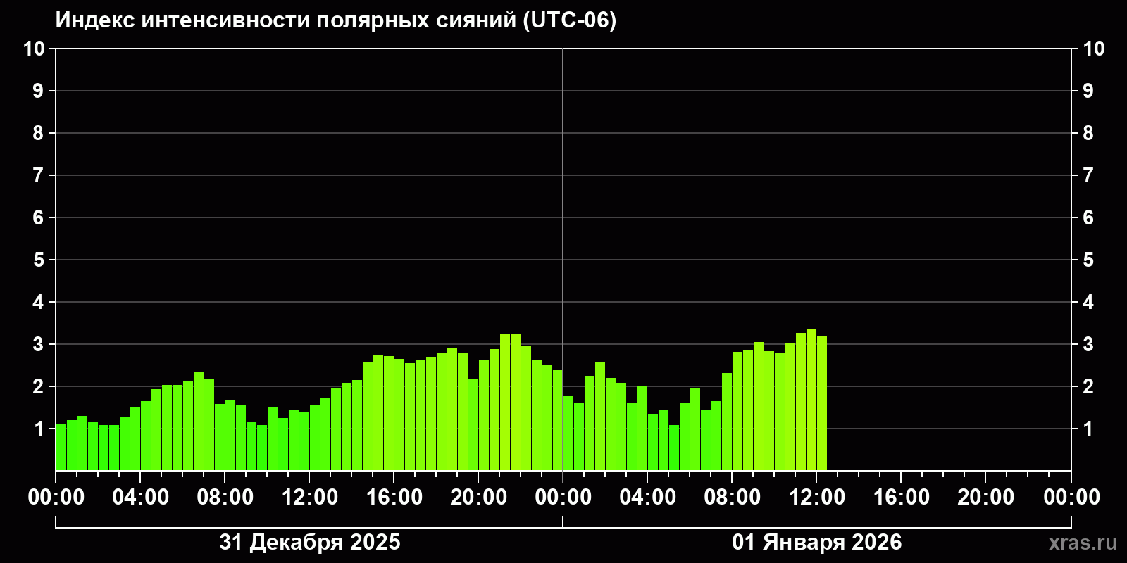 Изменения индекса интенсивности полярных сияний с 2025-12-31 по 2026-01-01 по местному времени