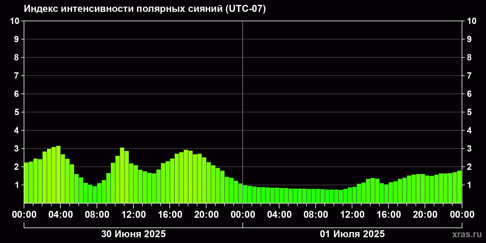 Изменения индекса интенсивности полярных сияний с 2025-06-30 по 2025-07-01 по местному времени