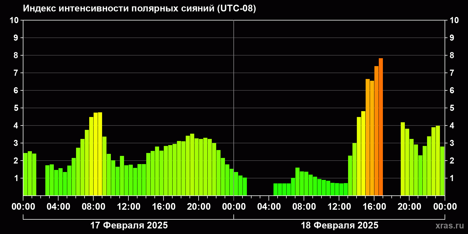 Изменения индекса интенсивности полярных сияний с 2025-02-17 по 2025-02-18 по местному времени