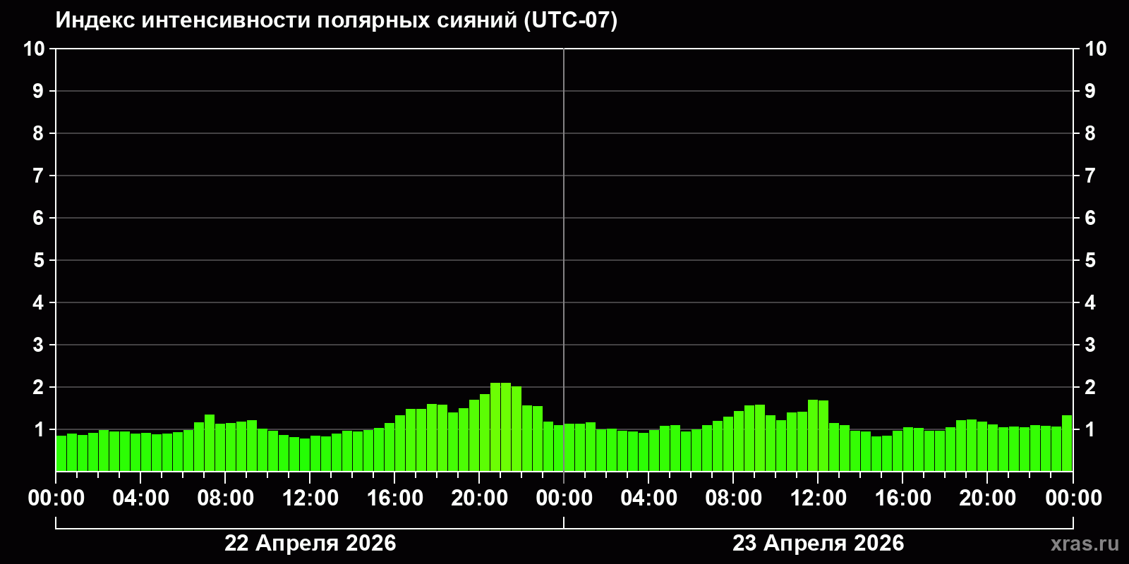 Изменения индекса интенсивности полярных сияний с 2026-04-22 по 2026-04-23 по местному времени