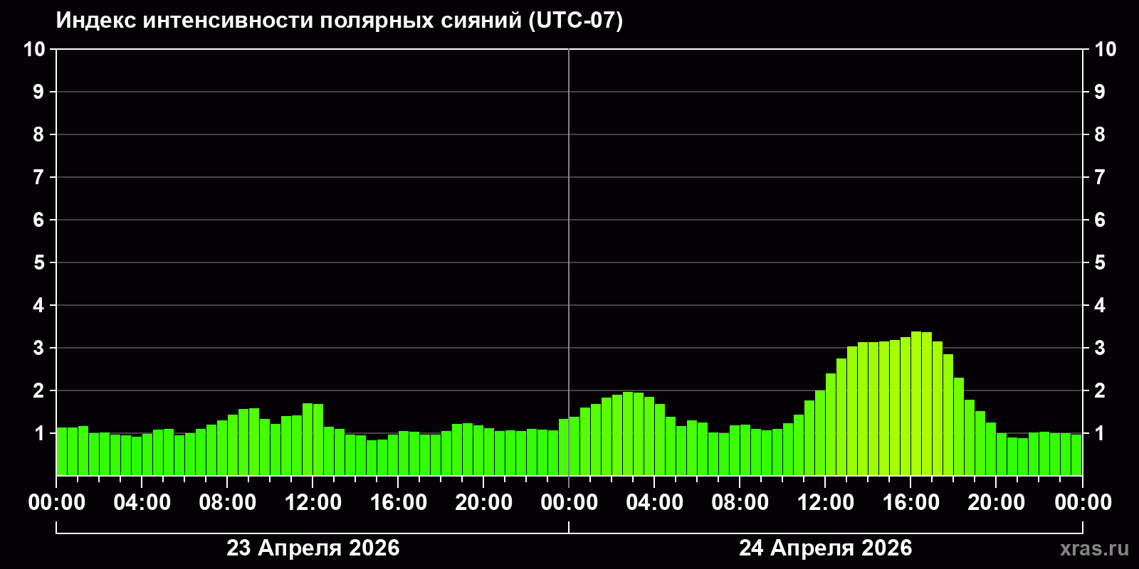 Изменения индекса интенсивности полярных сияний с 2026-04-23 по 2026-04-24 по местному времени