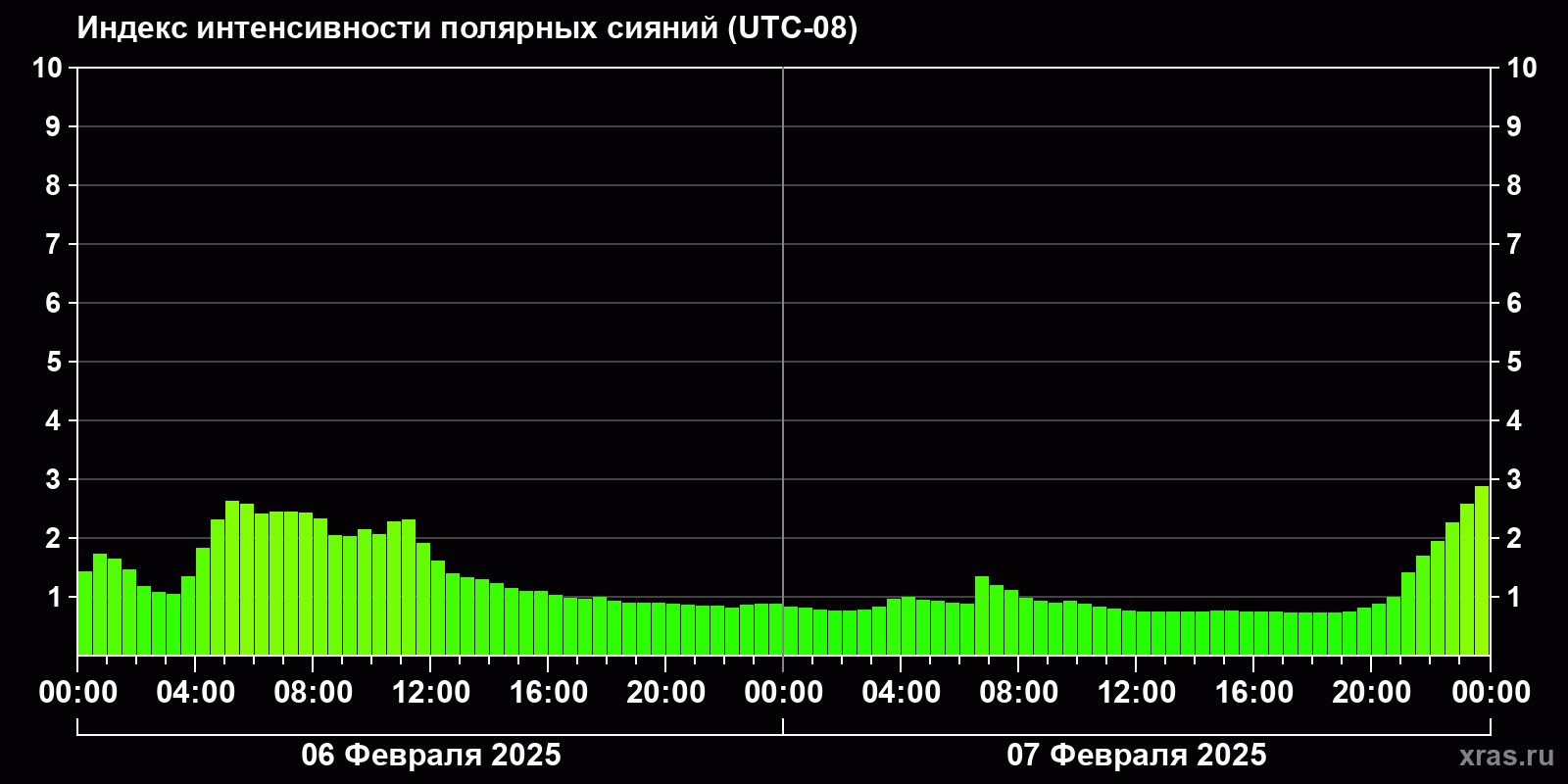 Изменения индекса интенсивности полярных сияний с 2025-02-06 по 2025-02-07 по местному времени