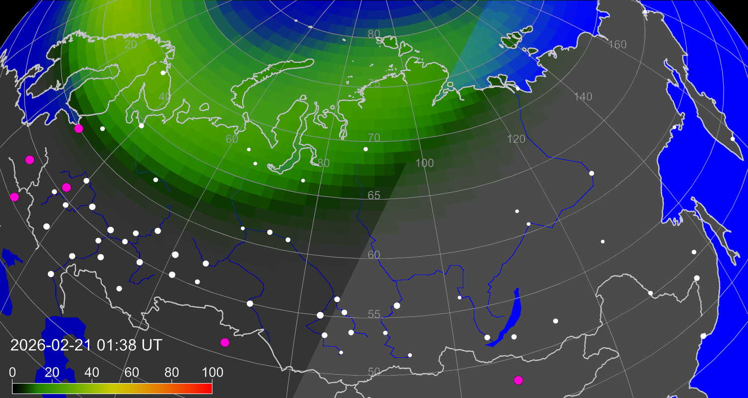 Индекс интенсивности полярных сияний и теоретически возможная широта наблюдений для ночного времени в восточном полушарии