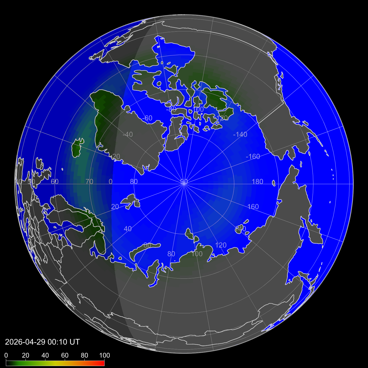 Индекс интенсивности полярных сияний и теоретически возможная широта наблюдений для ночного времени в западном полушарии