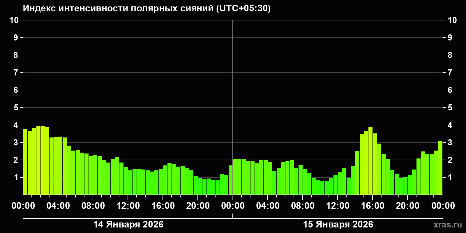 Изменения индекса интенсивности полярных сияний с 2026-01-14 по 2026-01-15 по местному времени