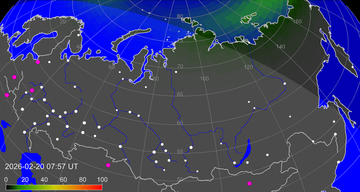 Вероятность полярных сияний в городах Российской Федерации