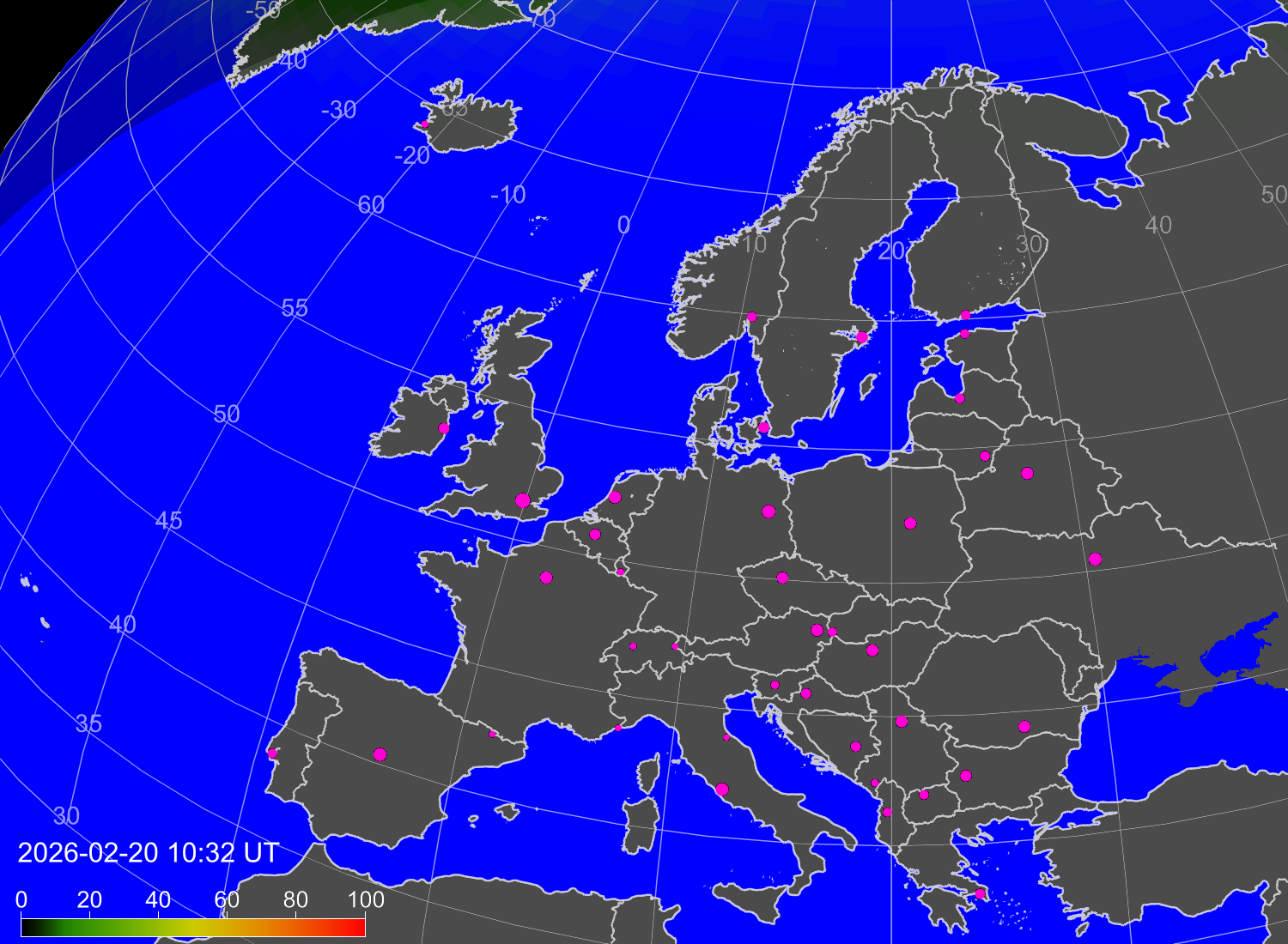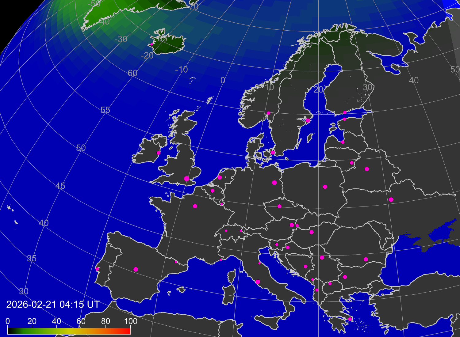 Индекс интенсивности полярных сияний и теоретически возможная широта наблюдений для ночного времени в восточном полушарии