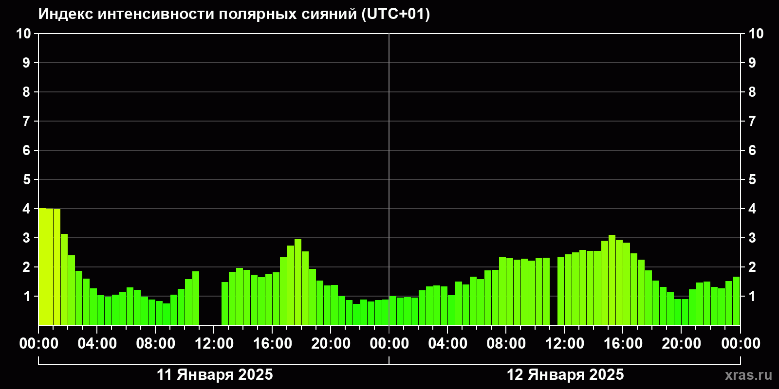 Изменения индекса интенсивности полярных сияний с 2025-01-11 по 2025-01-12 по местному времени