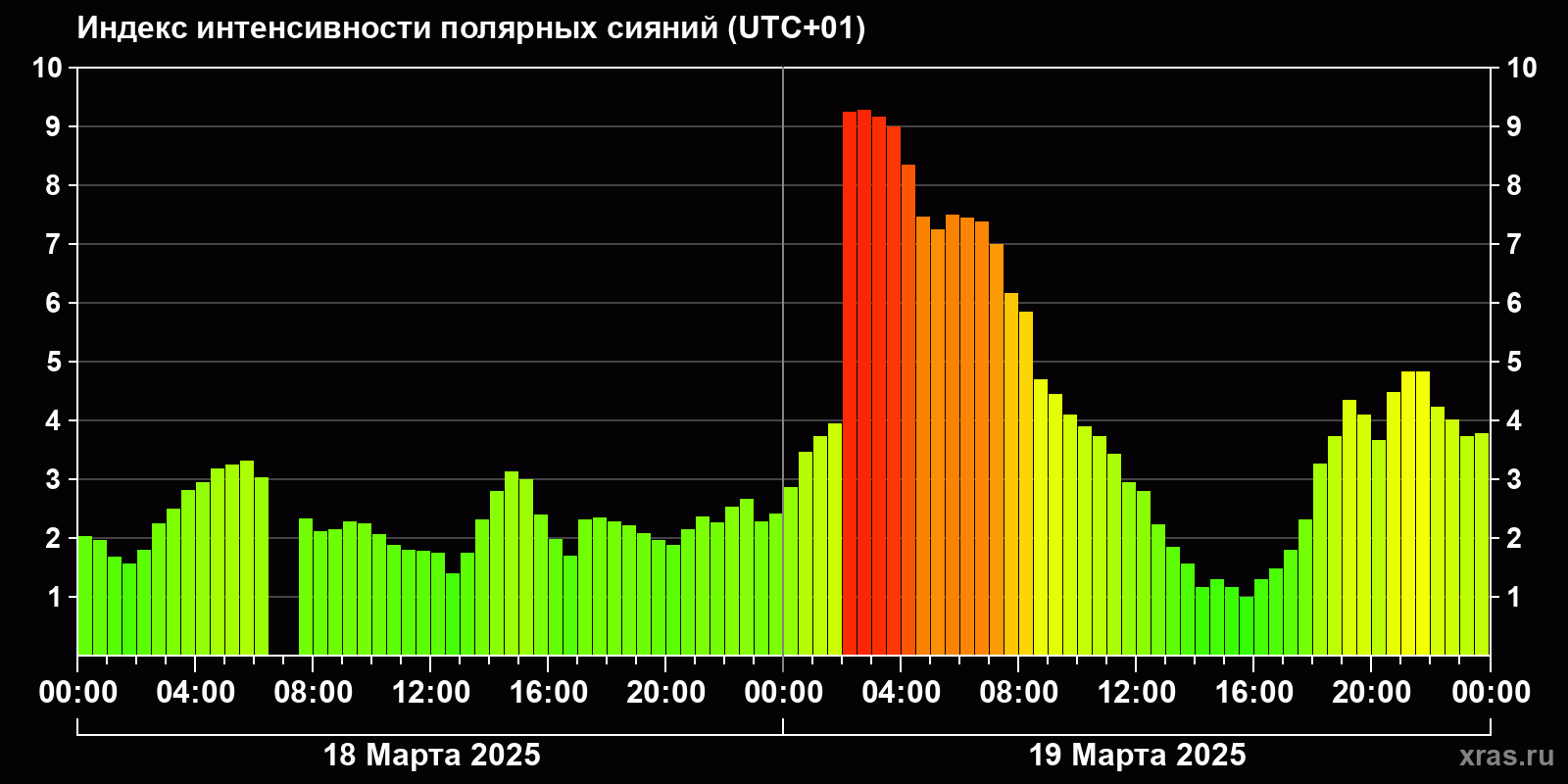 Изменения индекса интенсивности полярных сияний с 2025-03-18 по 2025-03-19 по местному времени