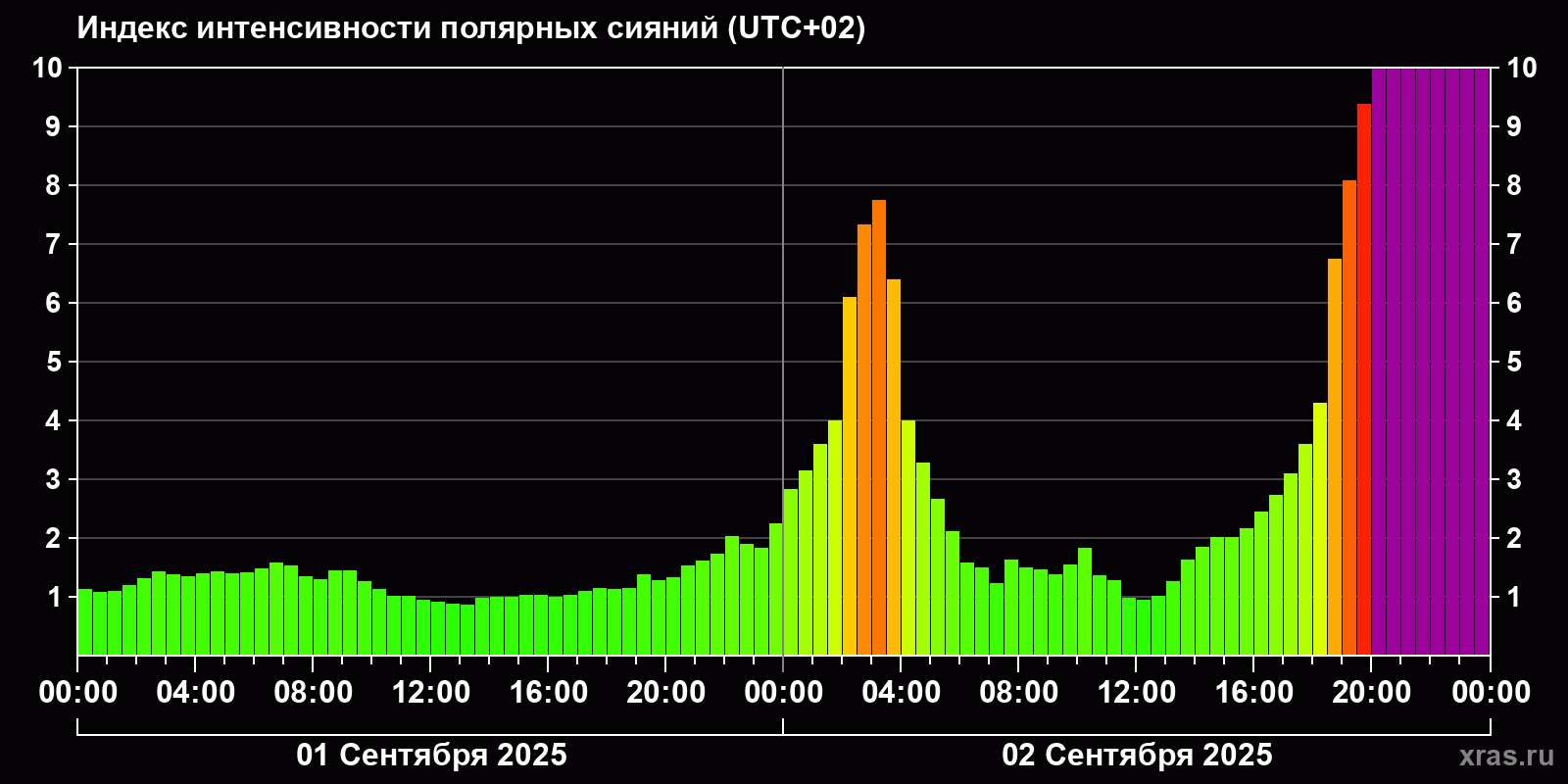 Изменения индекса интенсивности полярных сияний с 2025-09-01 по 2025-09-02 по местному времени
