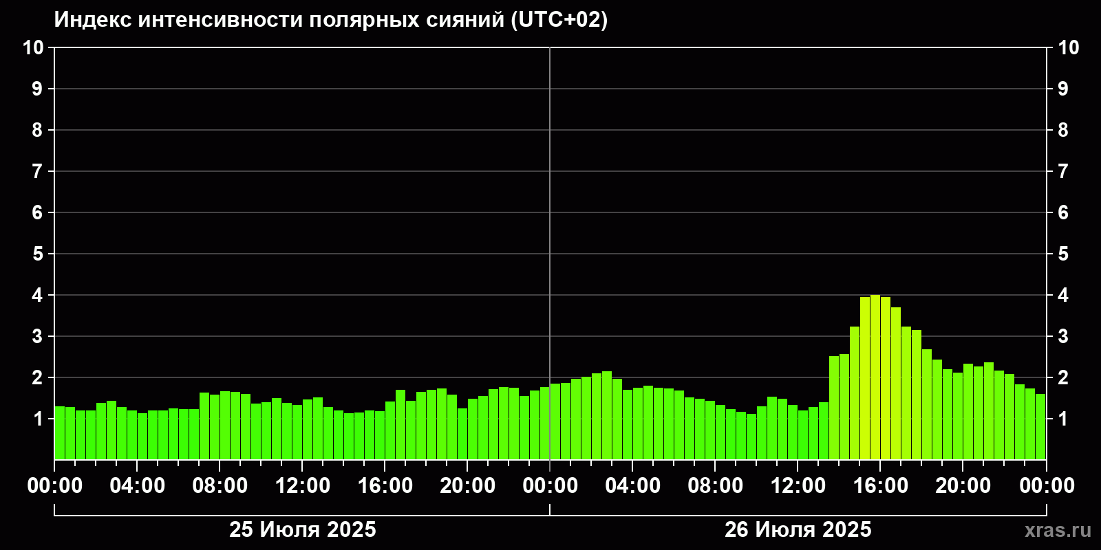 Изменения индекса интенсивности полярных сияний с 2025-07-25 по 2025-07-26 по местному времени