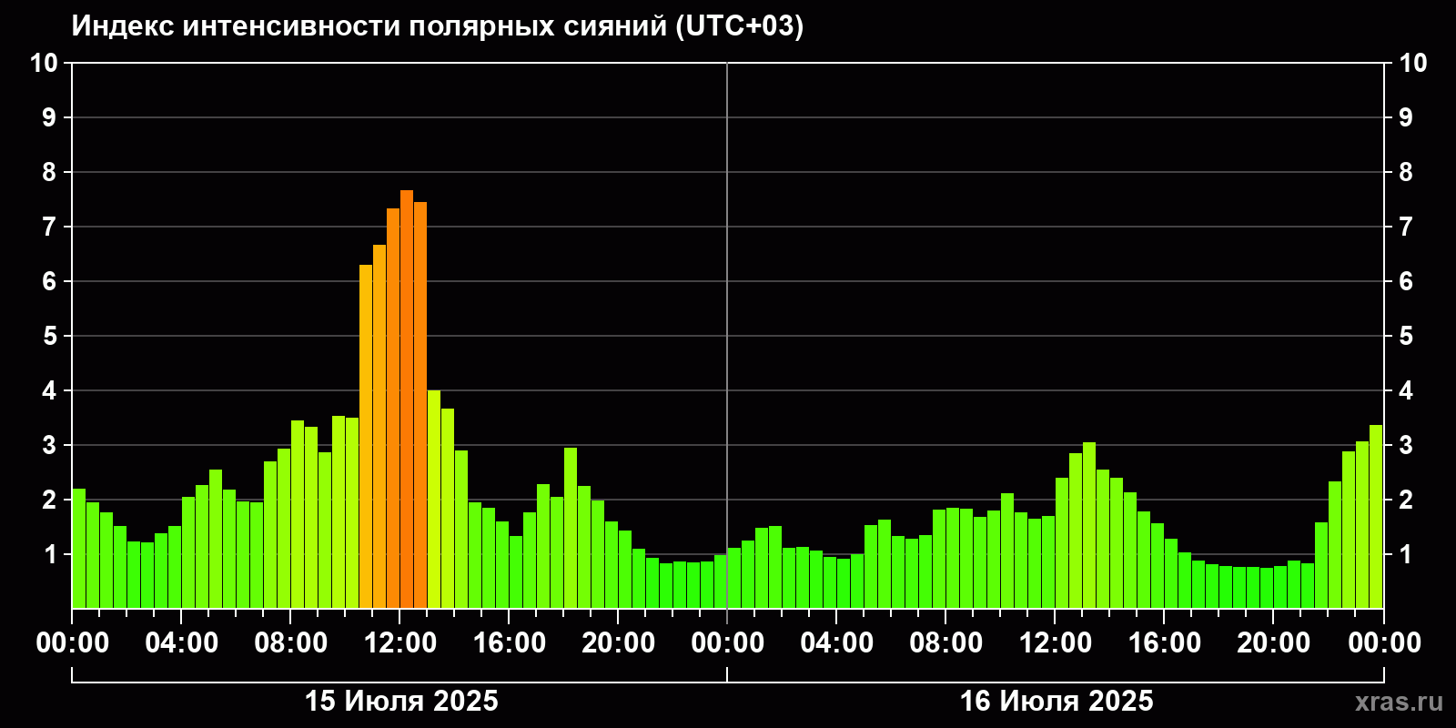 Изменения индекса интенсивности полярных сияний с 2025-07-15 по 2025-07-16 по местному времени