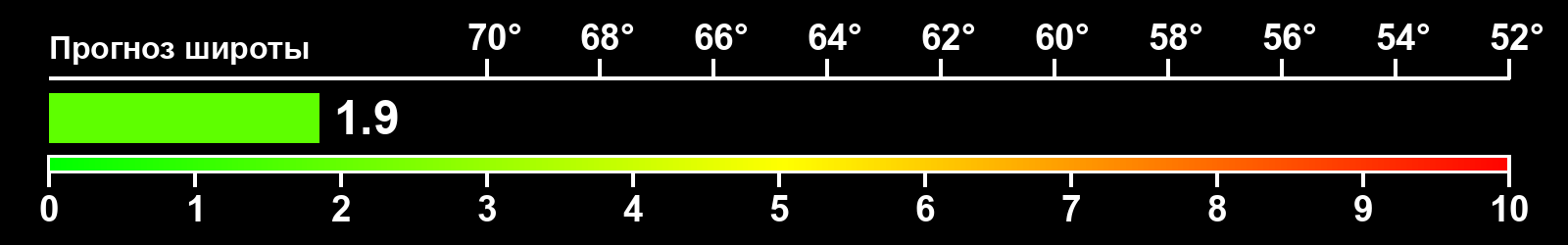 Индекс интенсивности полярных сияний и теоретически возможная широта наблюдений для ночного времени в восточном полушарии по состоянию на 2026-02-27 23:55 (конец дня) по местному времени