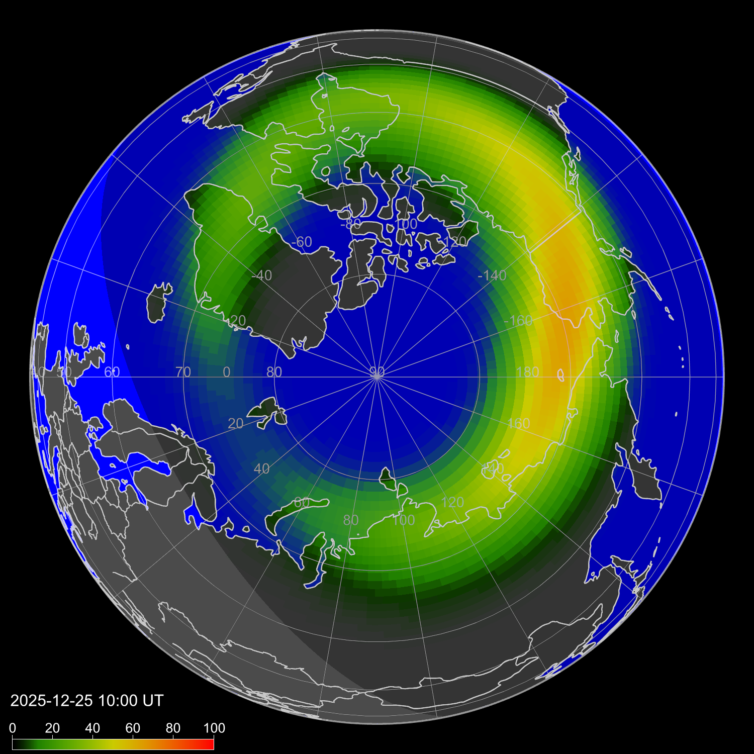 Изменения и часовой прогноз индекса интенсивности полярных сияний с 2025-12-23 по 2025-12-24