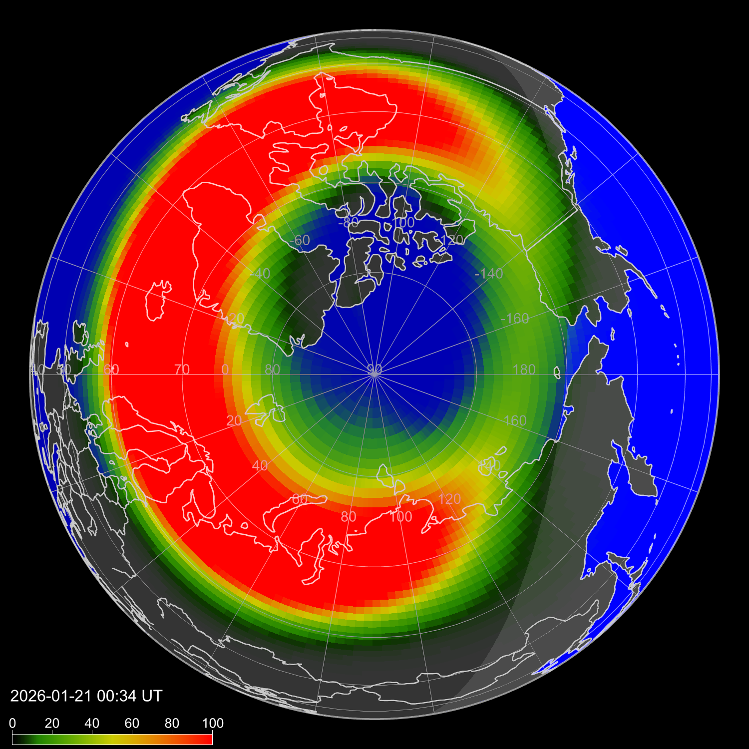 Изменения и часовой прогноз индекса интенсивности полярных сияний с 2026-01-20 по 2026-01-21