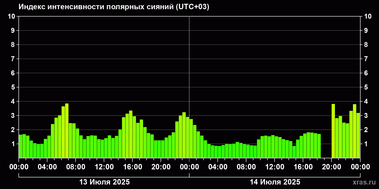 Изменения индекса интенсивности полярных сияний с 2025-07-13 по 2025-07-14 по местному времени