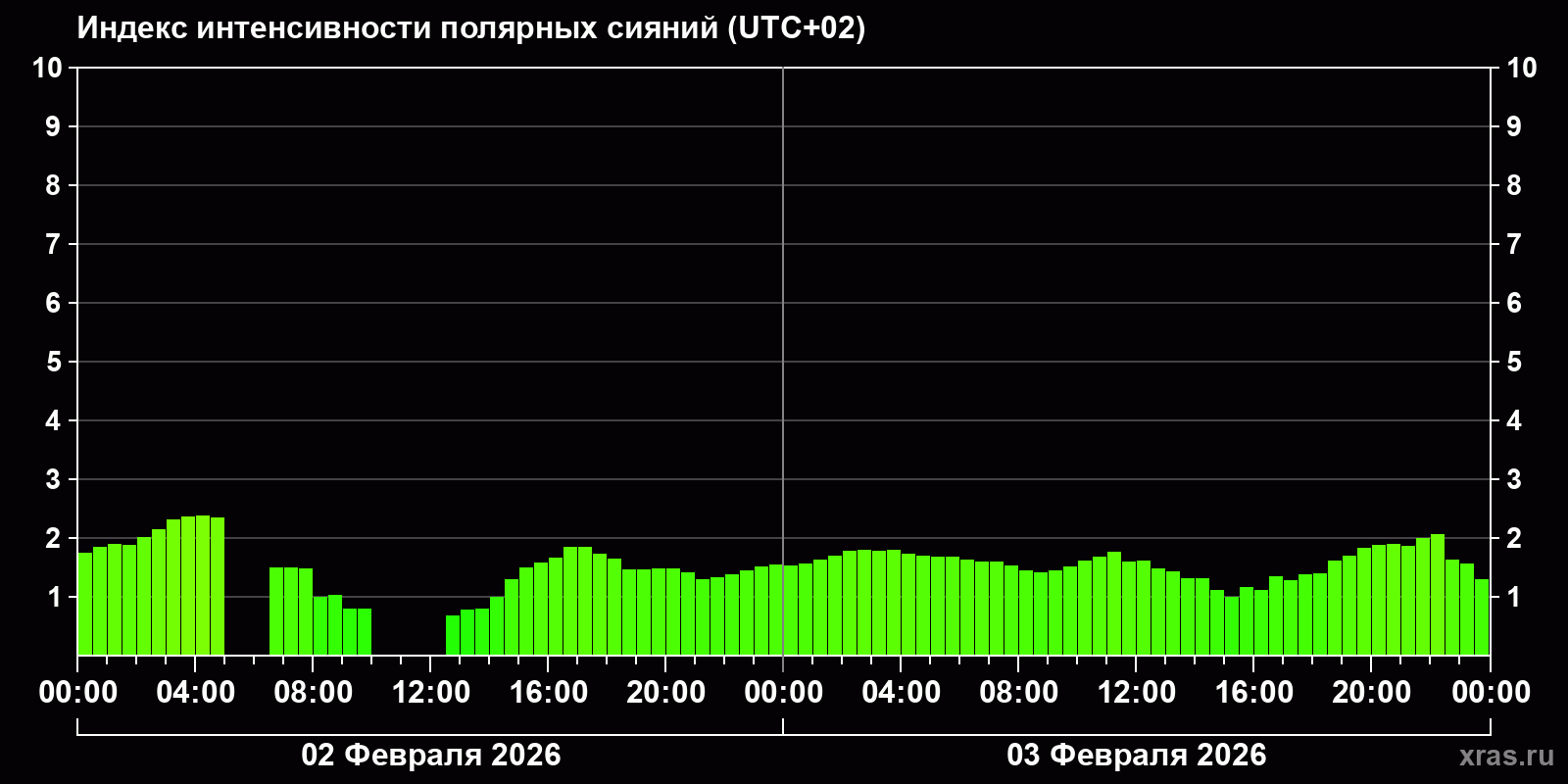 Изменения индекса интенсивности полярных сияний с 2026-02-02 по 2026-02-03 по местному времени