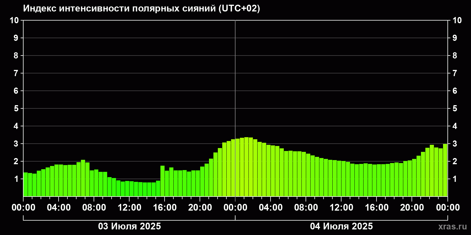 Изменения индекса интенсивности полярных сияний с 2025-07-04 по 2025-07-05 по местному времени
