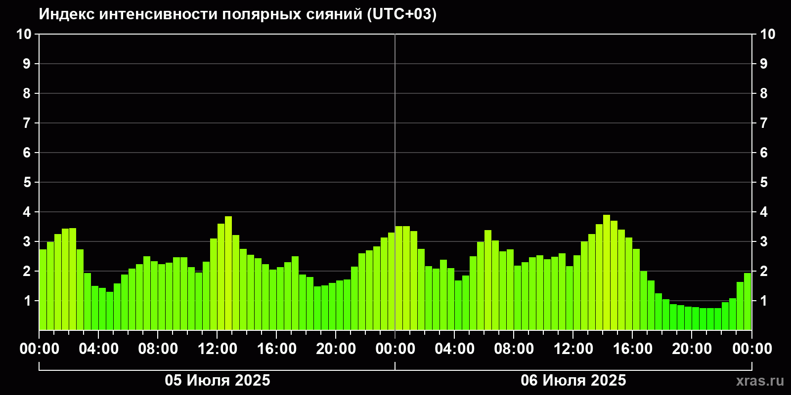 Изменения индекса интенсивности полярных сияний с 2025-07-05 по 2025-07-06 по местному времени