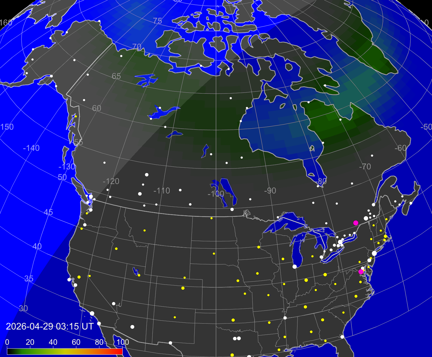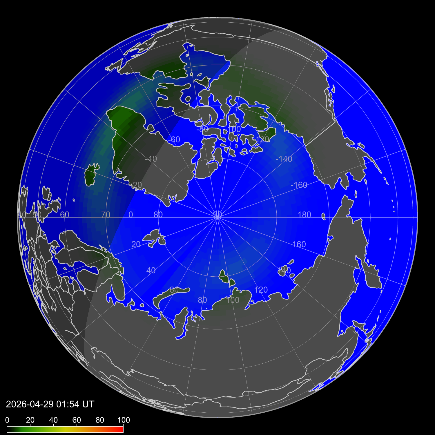 Индекс интенсивности полярных сияний и теоретически возможная широта наблюдений для ночного времени в западном полушарии