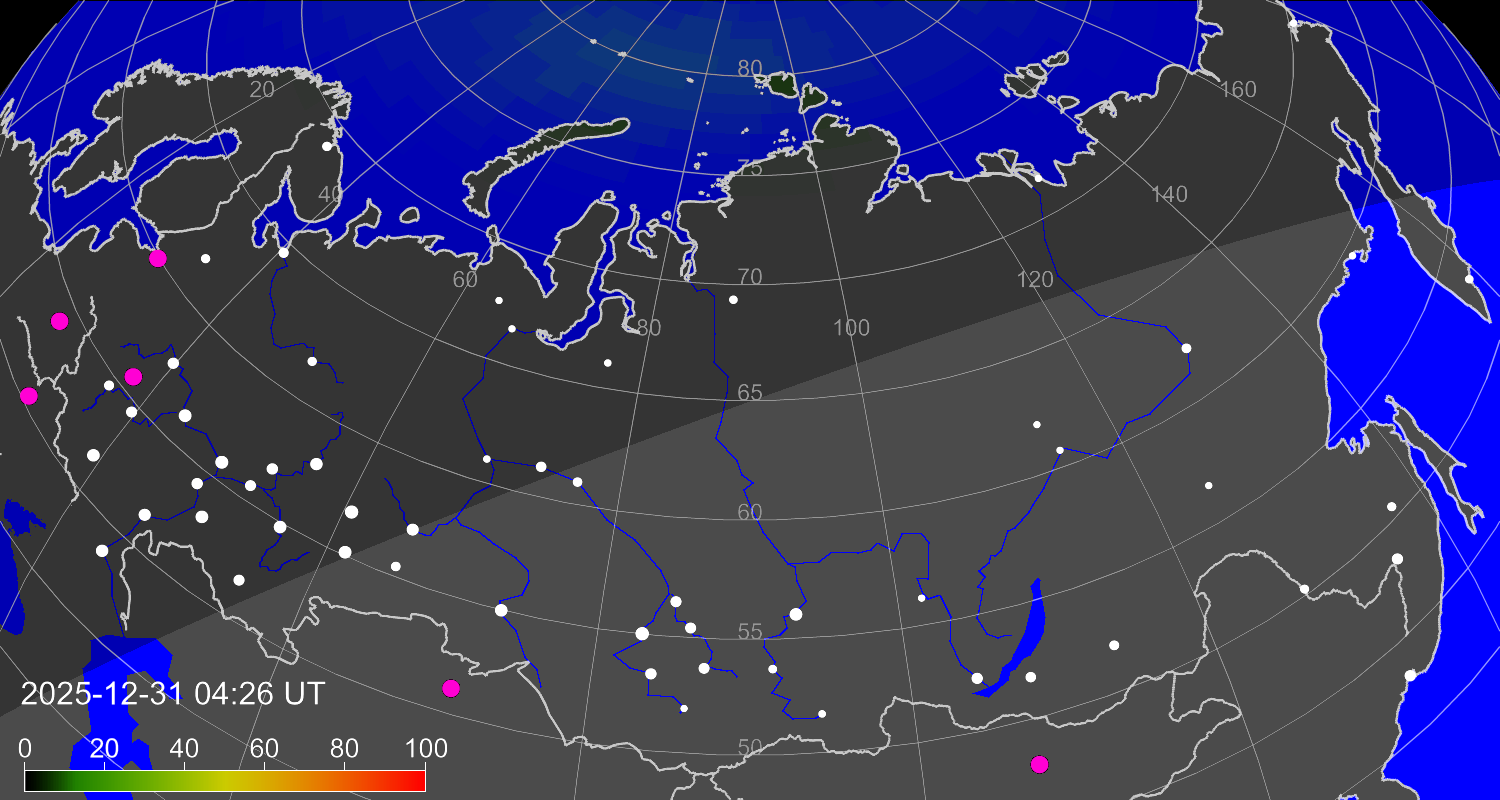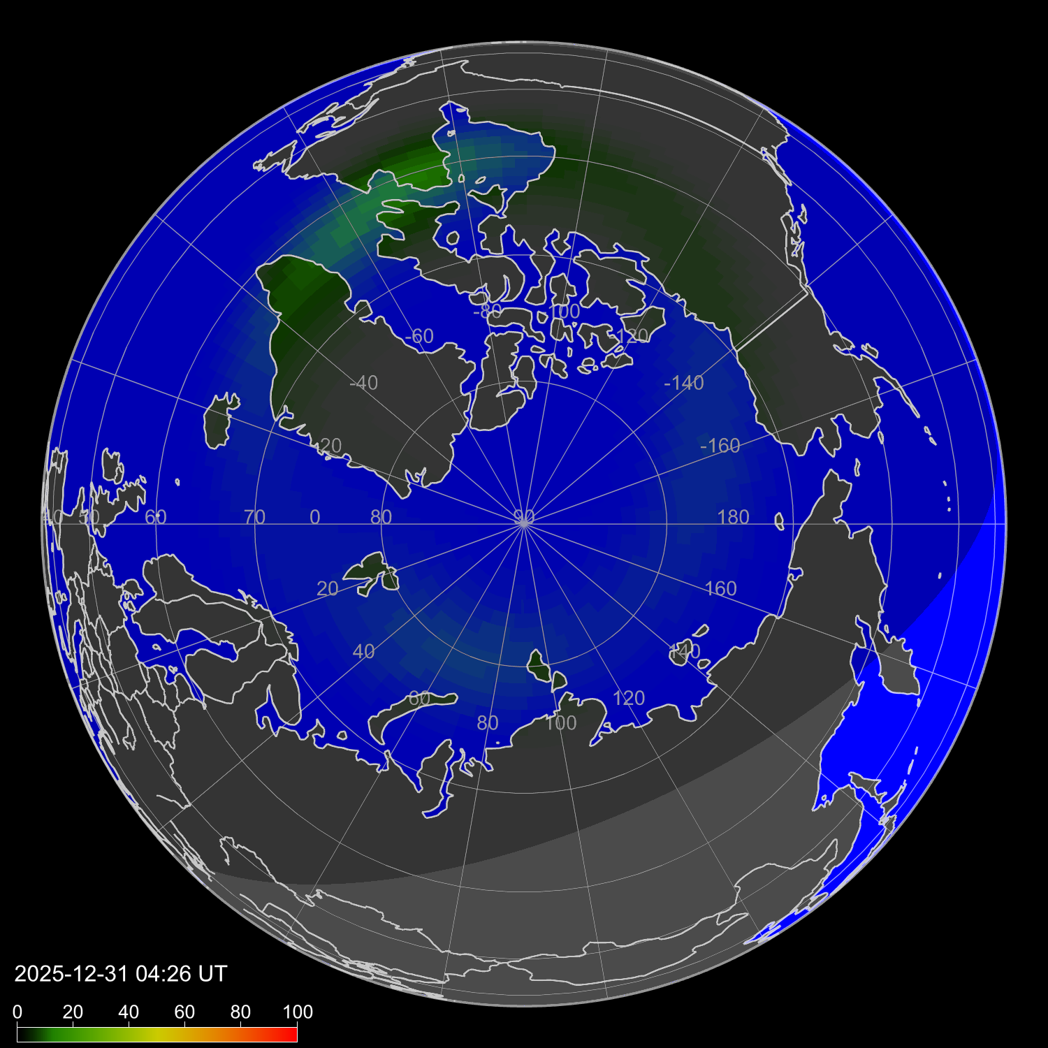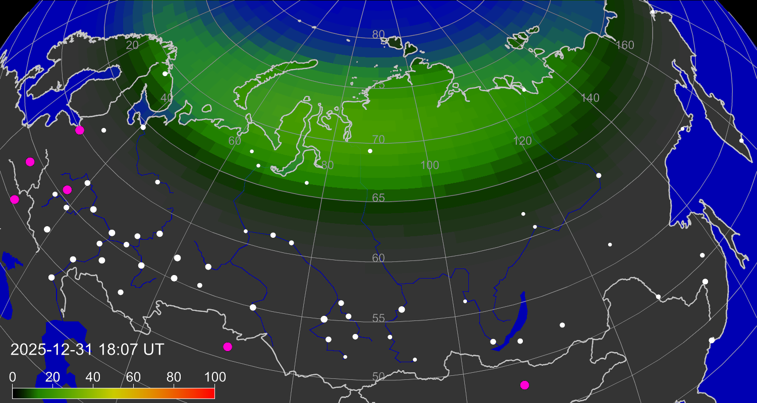 Изменения и часовой прогноз индекса интенсивности полярных сияний с 2025-12-31 по 2026-01-01