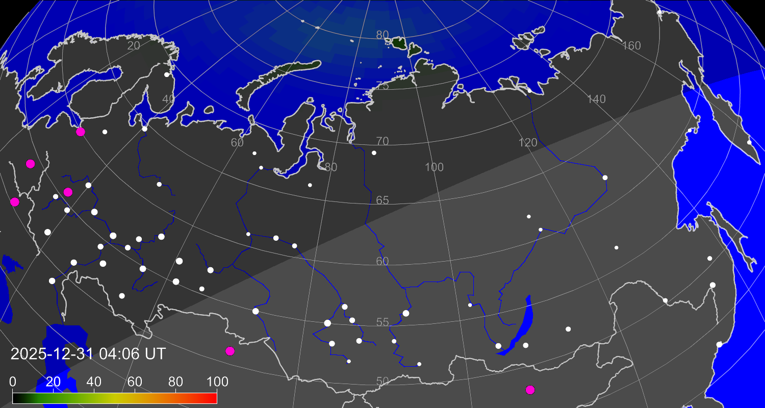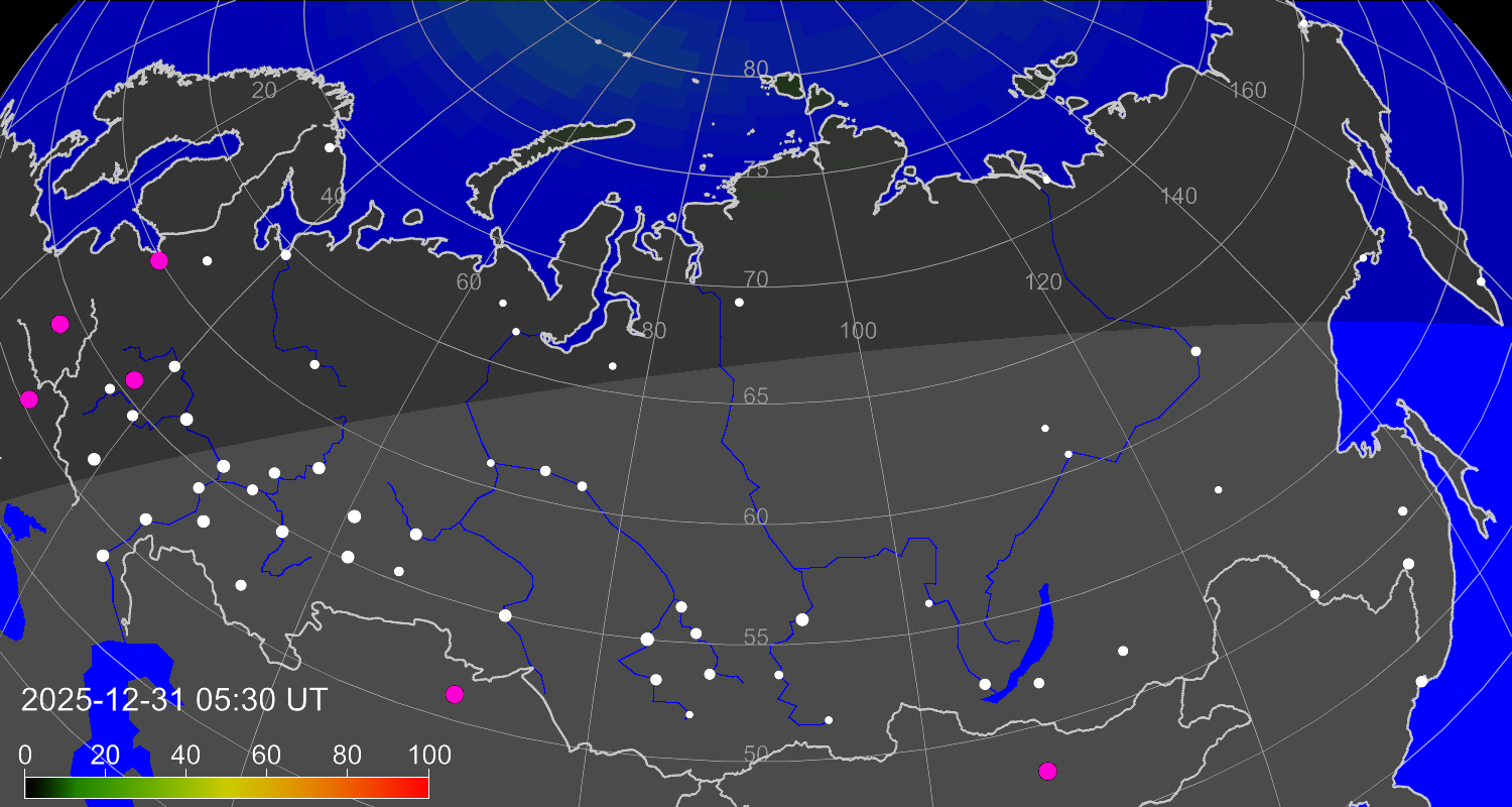 Индекс интенсивности полярных сияний и теоретически возможная широта наблюдений для ночного времени в восточном полушарии
