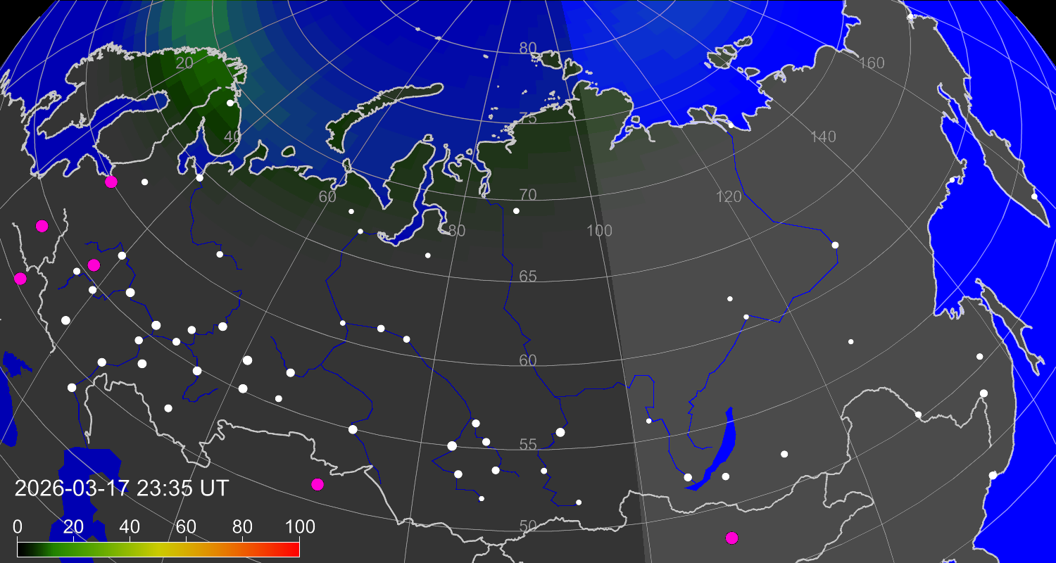 Вероятность полярных сияний в городах Российской Федерации