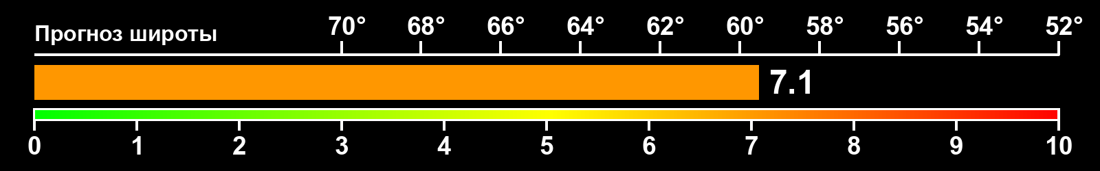 Индекс интенсивности полярных сияний и теоретически возможная широта наблюдений для ночного времени в восточном полушарии по состоянию на 2025-09-30 23:58 (конец дня) по местному времени