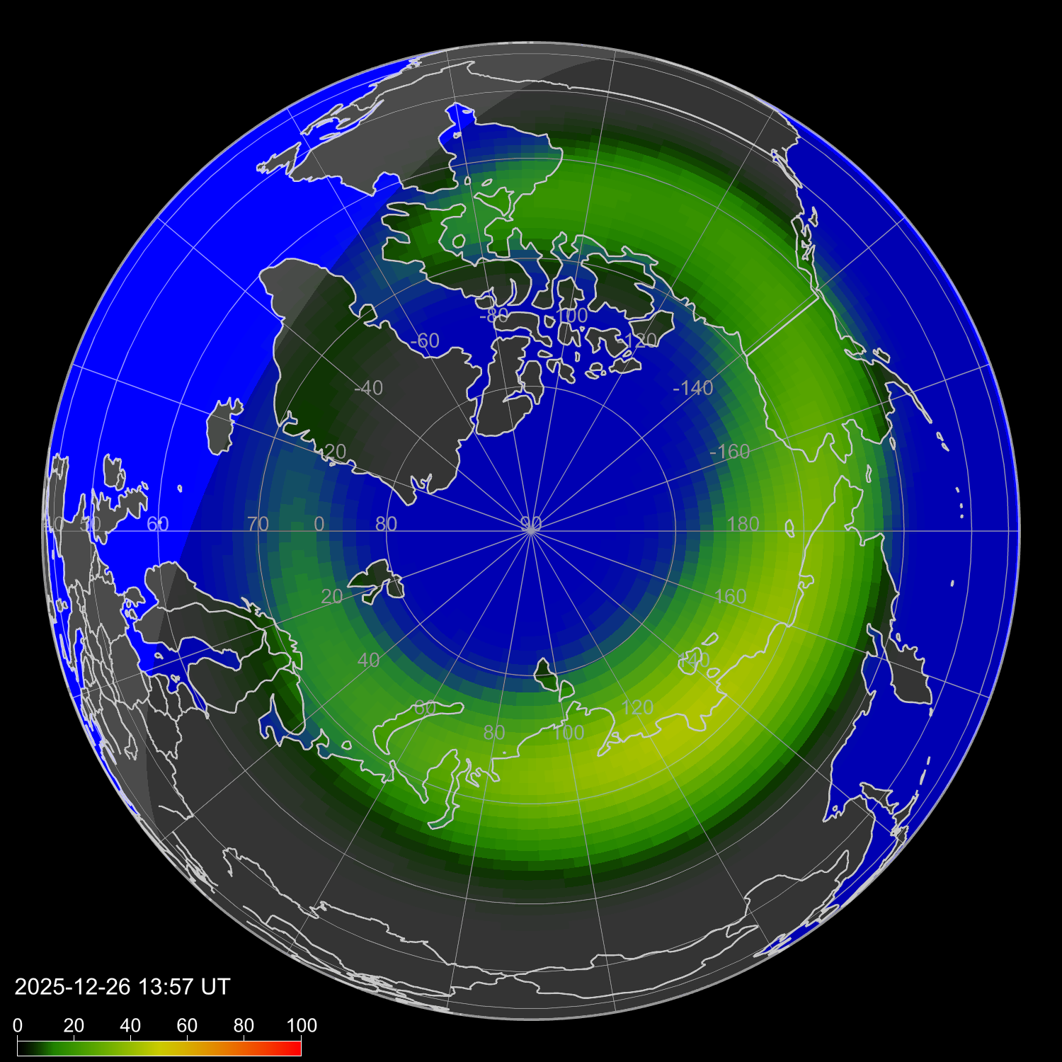 Изменения и часовой прогноз индекса интенсивности полярных сияний с 2025-12-25 по 2025-12-26
