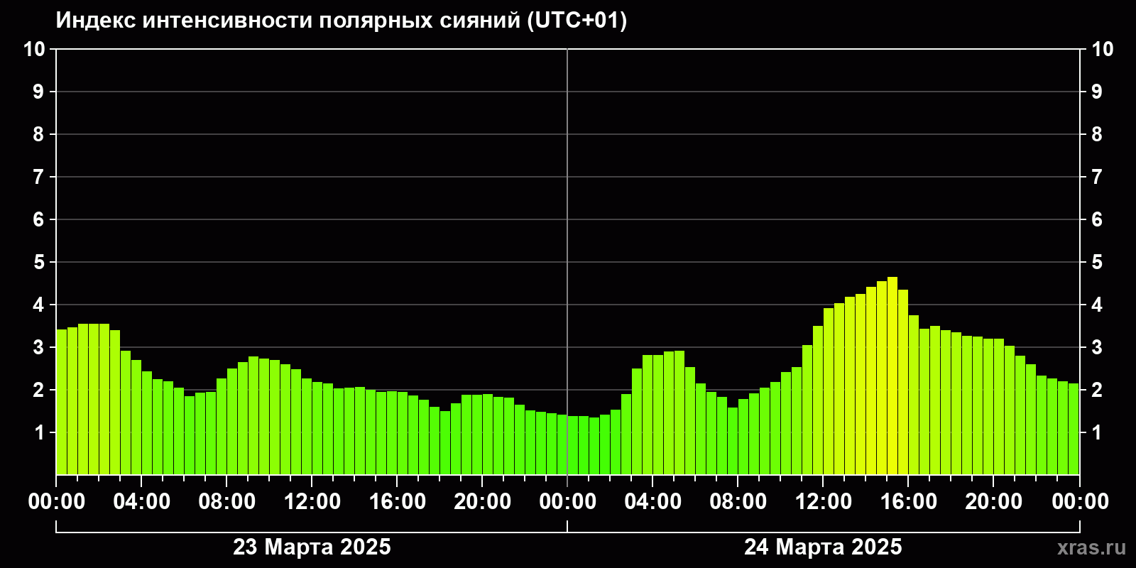 Изменения индекса интенсивности полярных сияний с 2025-03-23 по 2025-03-24 по местному времени