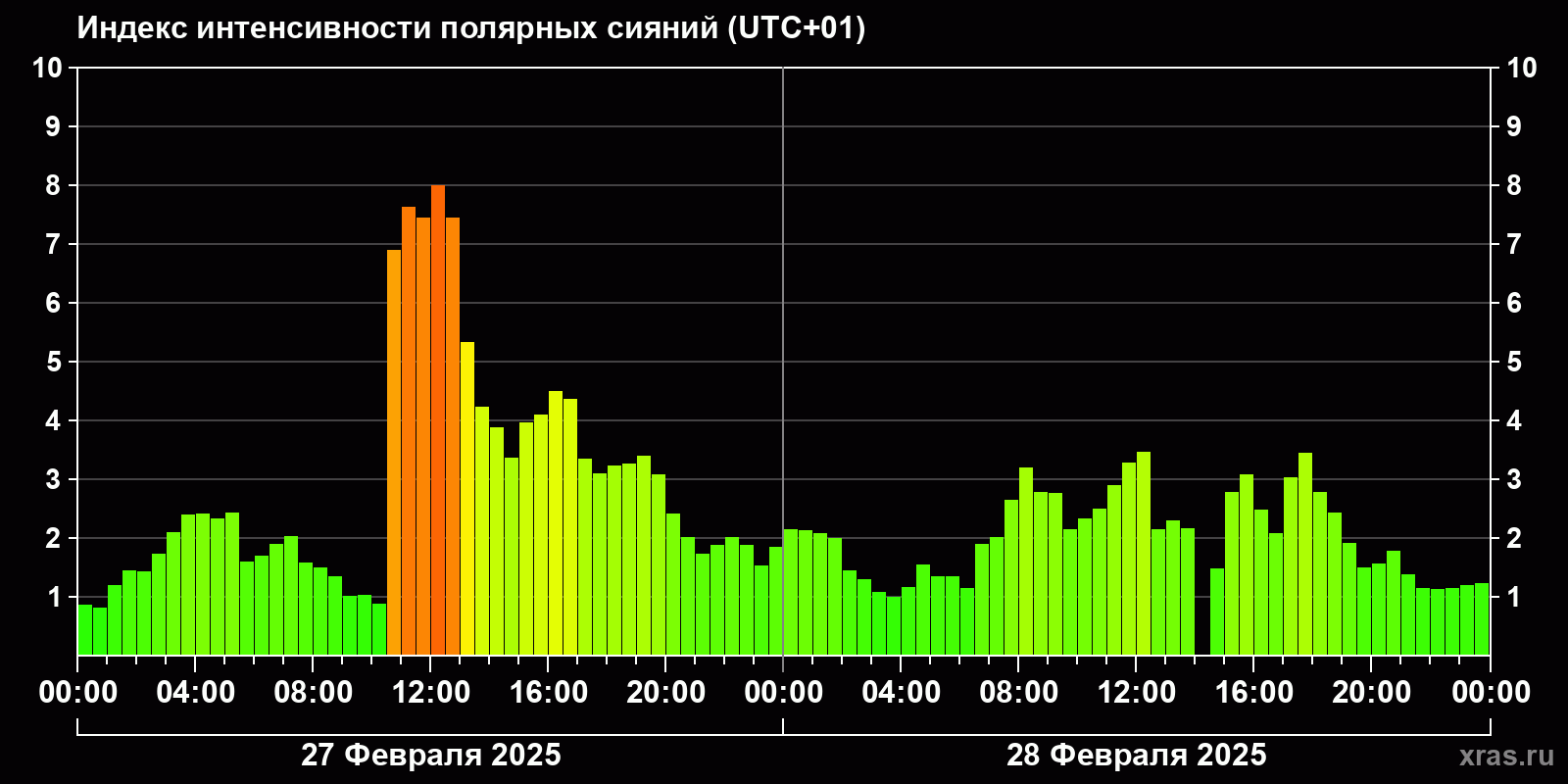 Изменения индекса интенсивности полярных сияний с 2025-02-27 по 2025-02-28 по местному времени