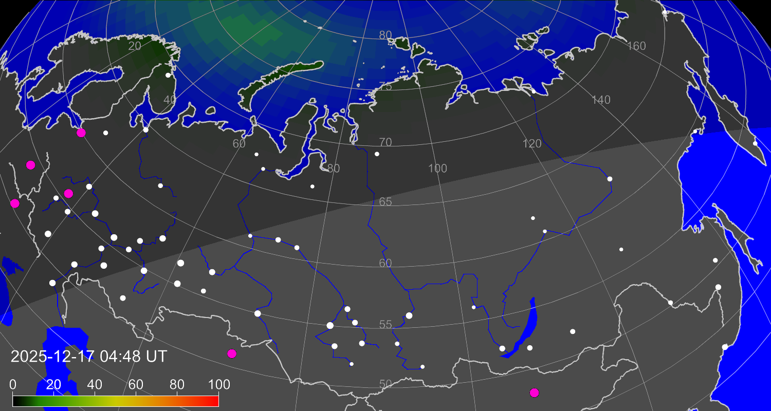 Индекс интенсивности полярных сияний и теоретически возможная широта наблюдений для ночного времени в восточном полушарии