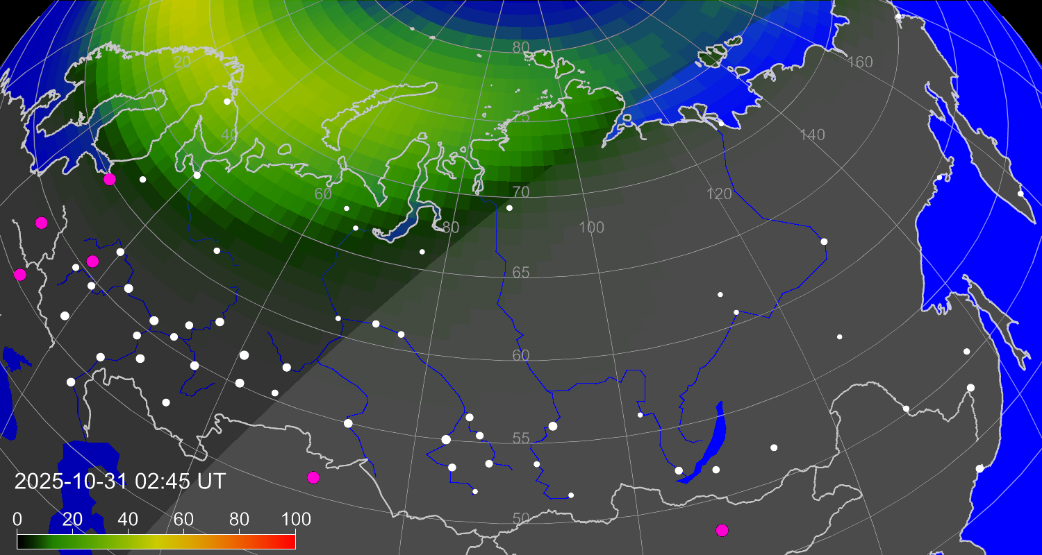Изменения и часовой прогноз индекса интенсивности полярных сияний с 2025-10-30 по 2025-10-31