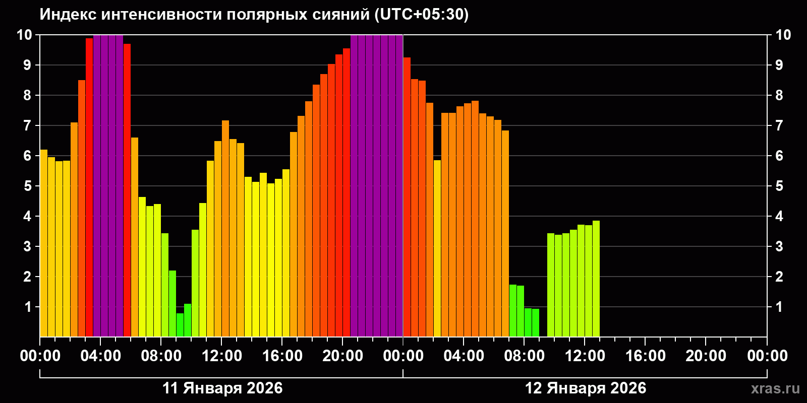 Изменения индекса интенсивности полярных сияний с 2026-01-11 по 2026-01-12 по местному времени