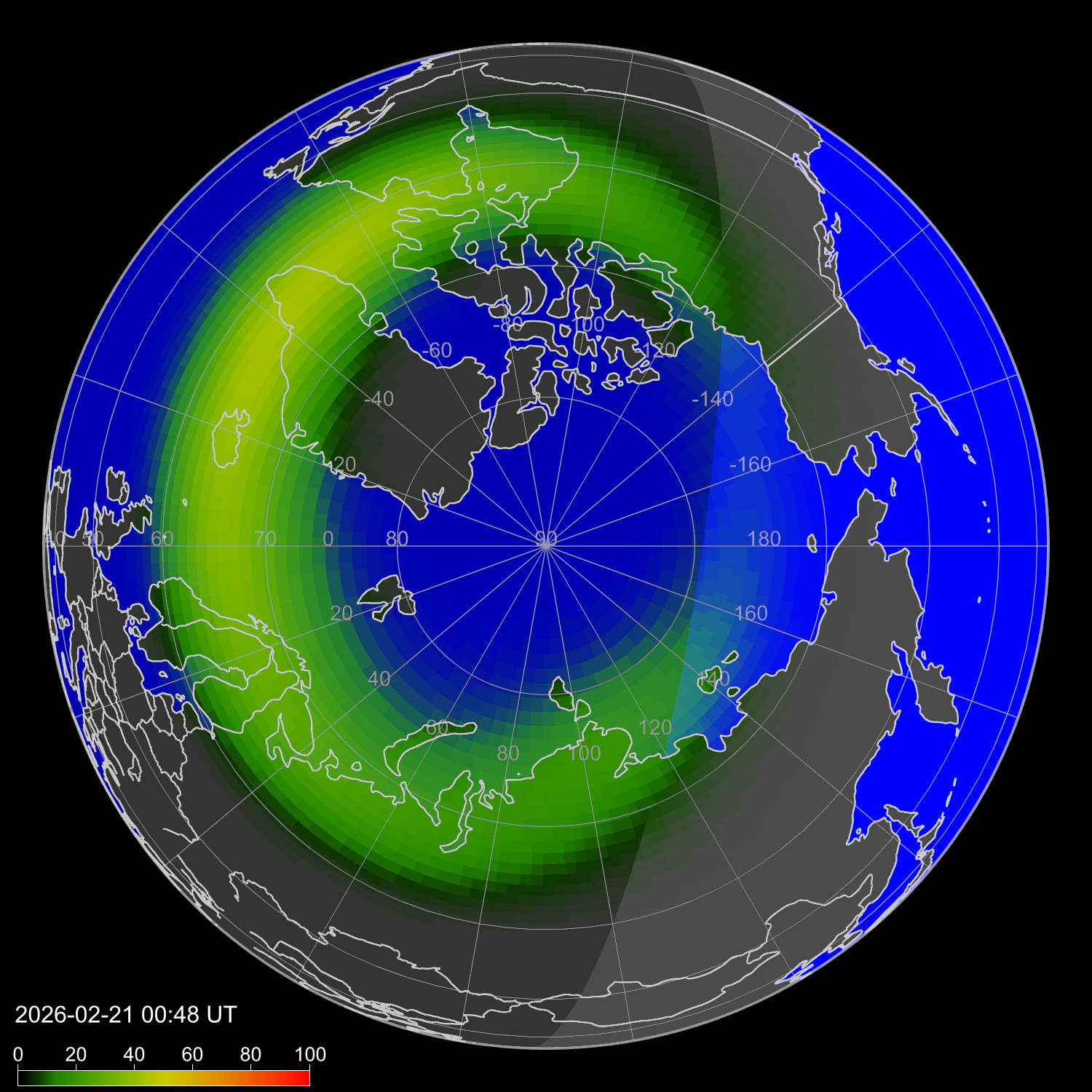 Изменения и часовой прогноз индекса интенсивности полярных сияний с 2026-02-19 по 2026-02-20