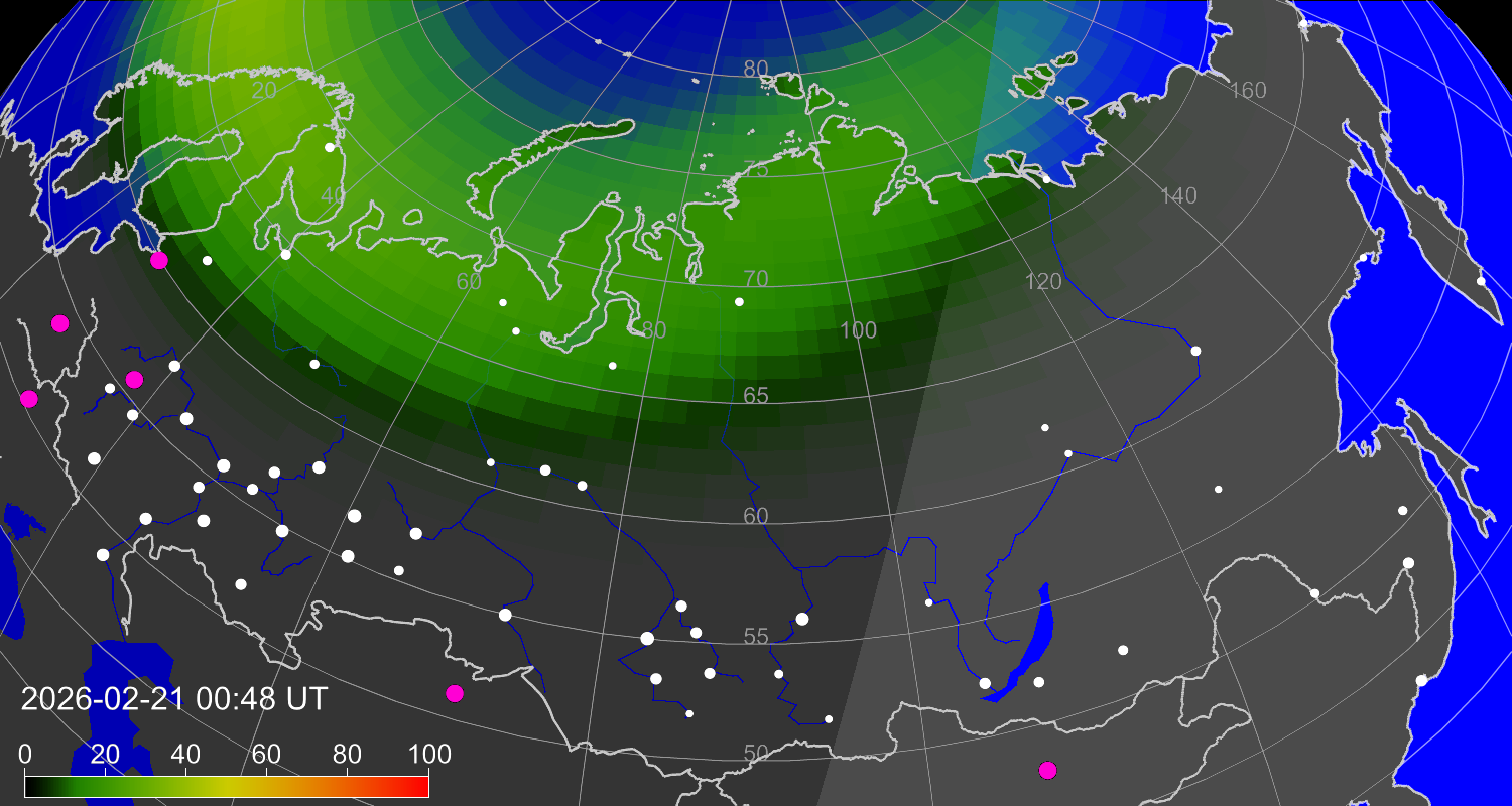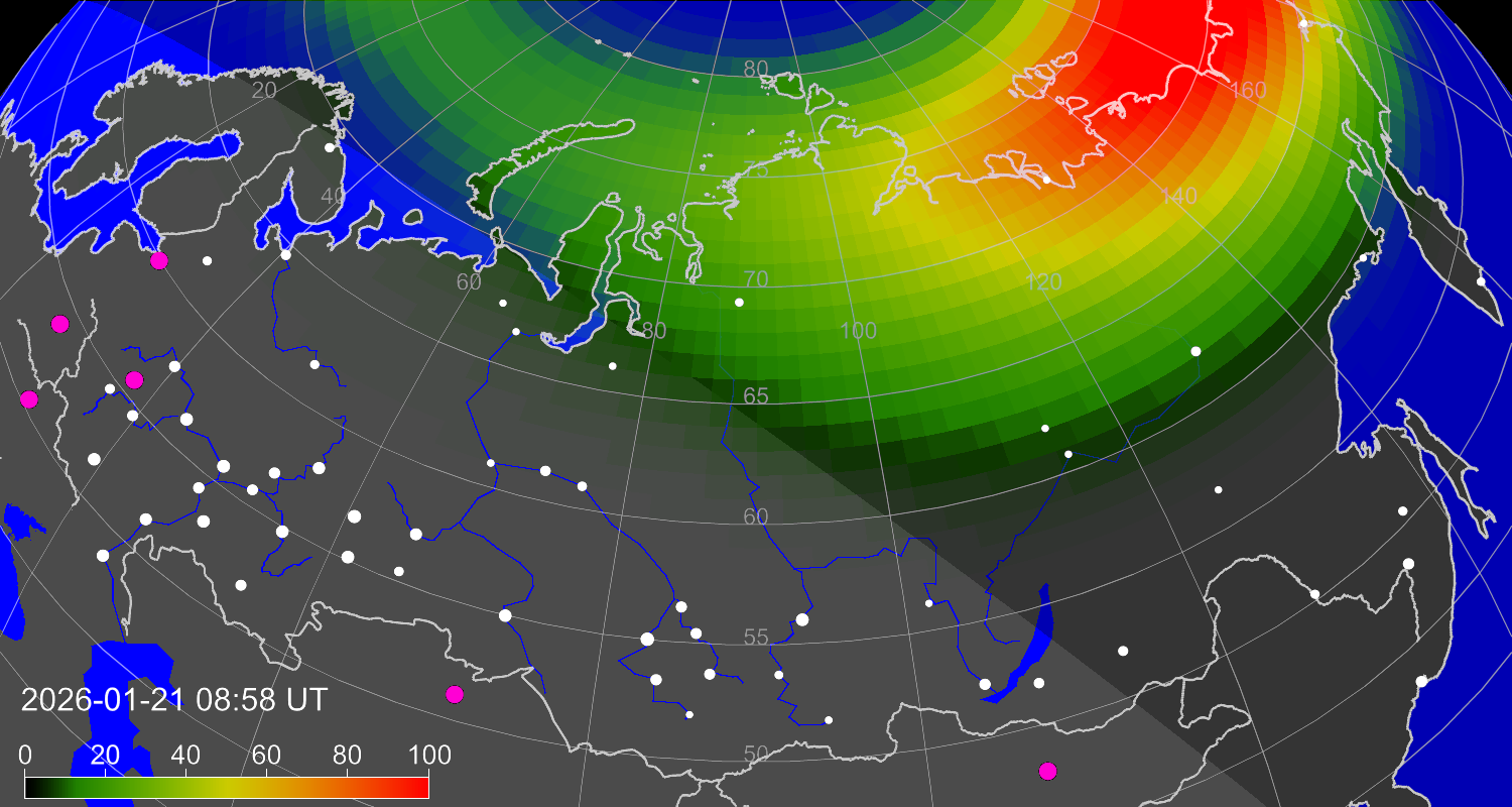 Индекс интенсивности полярных сияний и теоретически возможная широта наблюдений для ночного времени в восточном полушарии