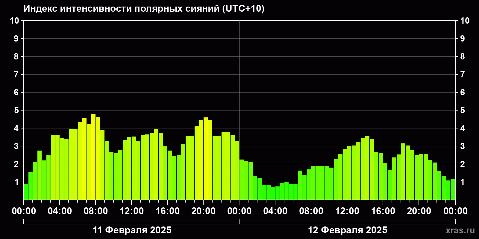 Изменения индекса интенсивности полярных сияний с 2025-02-11 по 2025-02-12 по местному времени