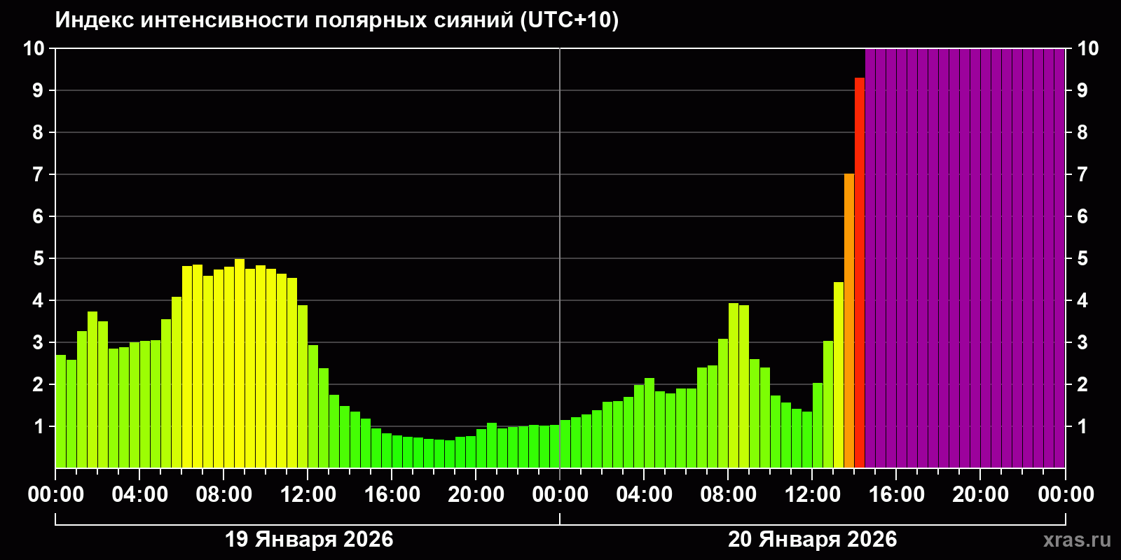 Изменения индекса интенсивности полярных сияний с 2026-01-19 по 2026-01-20 по местному времени