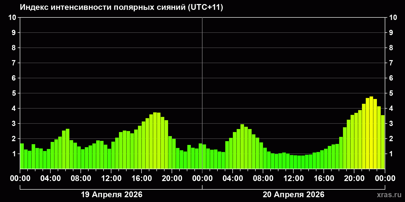 Изменения индекса интенсивности полярных сияний с 2026-04-19 по 2026-04-20 по местному времени