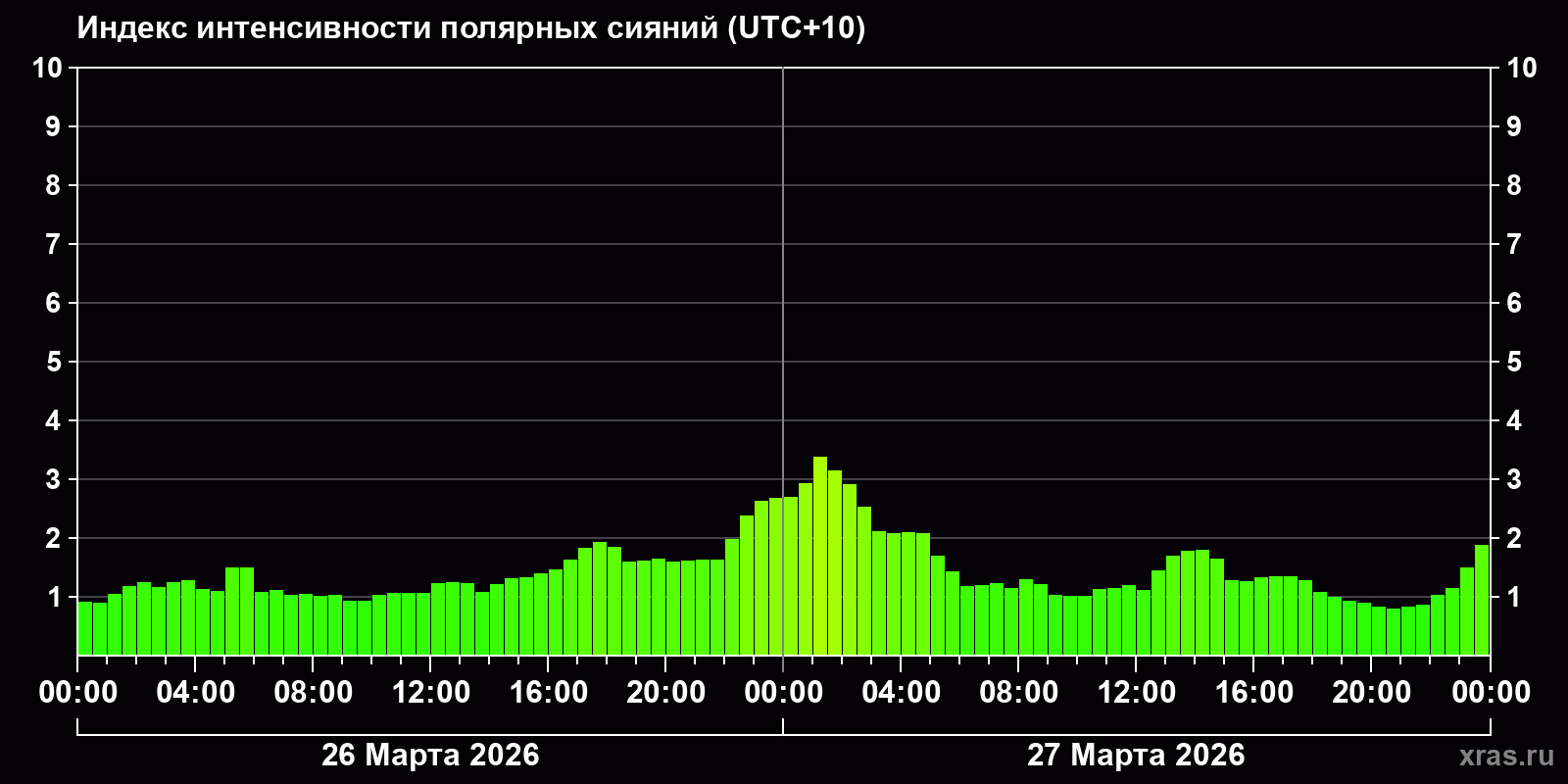 Изменения индекса интенсивности полярных сияний с 2026-03-26 по 2026-03-27 по местному времени