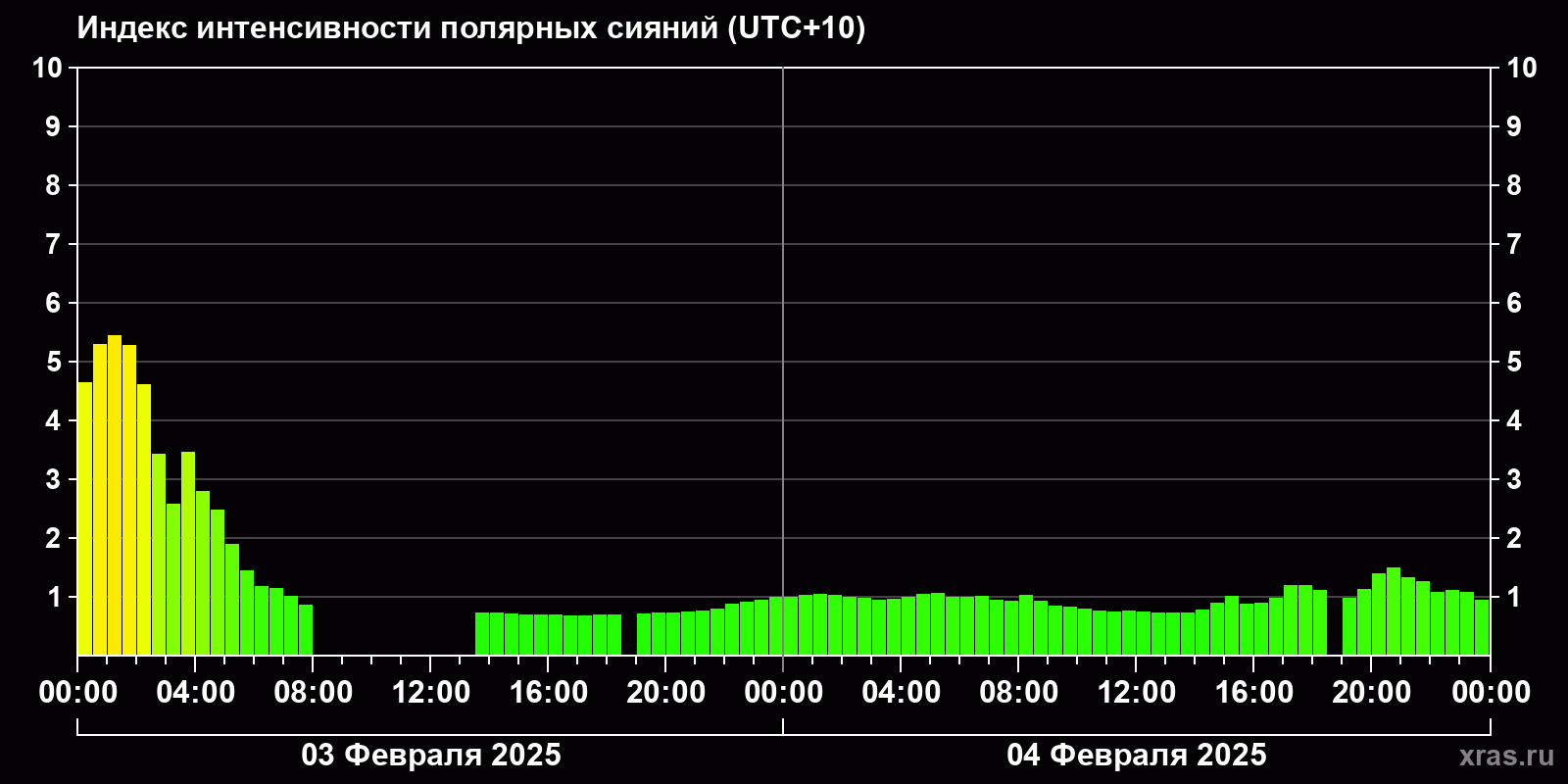 Изменения индекса интенсивности полярных сияний с 2025-02-03 по 2025-02-04 по местному времени