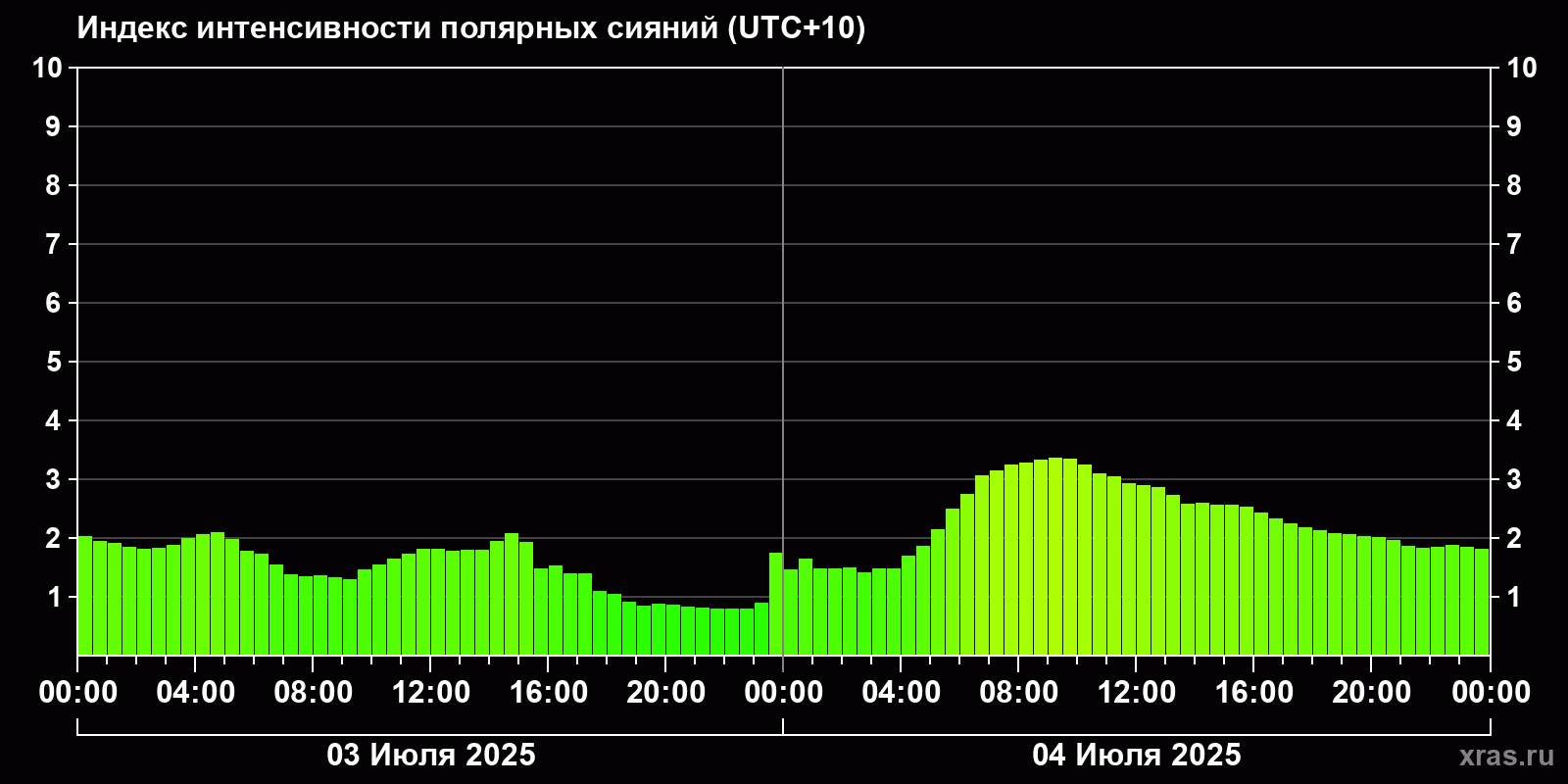 Изменения индекса интенсивности полярных сияний с 2025-07-03 по 2025-07-04 по местному времени